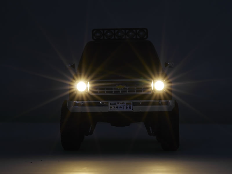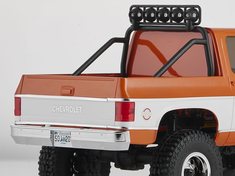 Der FMS FCX24 Chevrolet K5 Blazer, offiziell lizenziert von General Motors LLC, maximiert seinen statischen und dynamischen Wert in einem kompakten Paket. Zusätzlich zu den galvanisierten vorderen und hinteren Stoßstangen und dem Kühlergrill werden spezielle galvanisierte Aufkleber eingesetzt, um die verchromten Linien an den Seiten der Karosserie nachzubilden. Sowohl ein hinteres Dach als auch ein Überrollkäfig (einschließlich Lichtkuppeln) sind in der Box enthalten – entfernt man das hintere Dach, erhält man einen Pickup. Das integrierte Beleuchtungssystem kann direkt über die Fernsteuerung geschaltet werden.