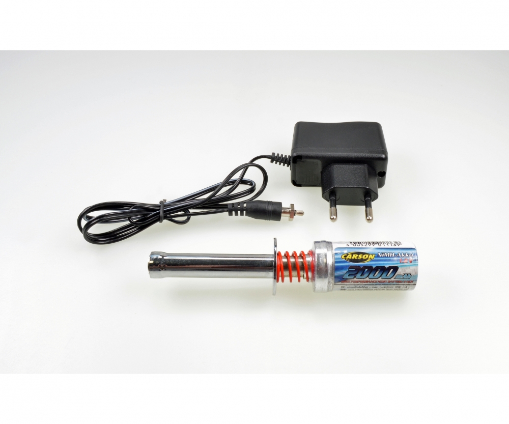 Glühkerzenstecker mit integriertem 2500 mAh NiMH-Akku und 230 V Steckerlader mit 600 mA Ladestrom.