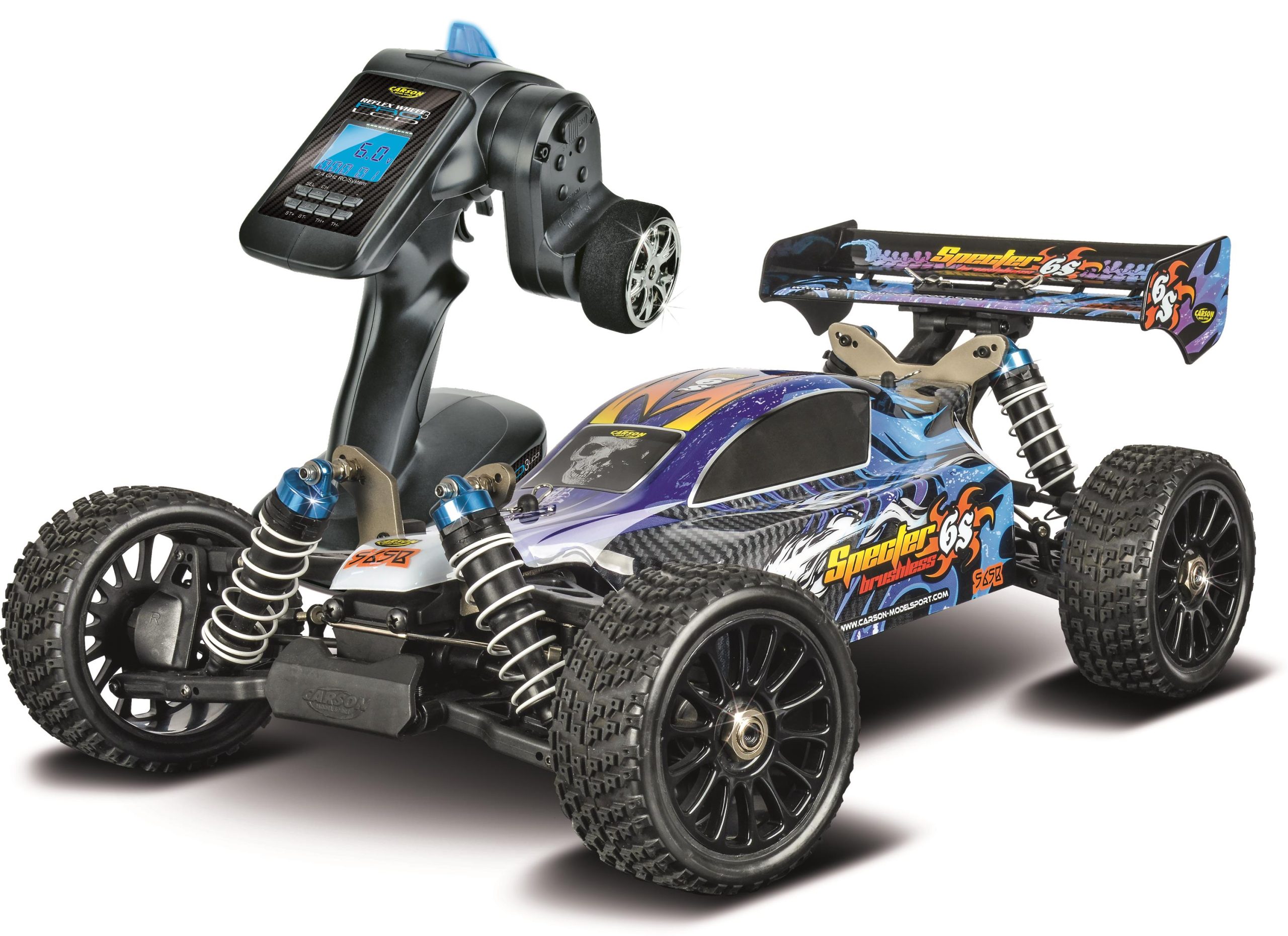 Der CARSON Specter Brushless 6S ist der innovative 4WD Buggy mit einem für Off Road-Pisten optimierten Race-Chassis und kraftvollem Brushless-Antrieb. Um das Lenkservo vor Feuchtigkeit zu schützen, wurde das Gehäuse abgedichtet. Das robuste 3 mm Alu-Chassis hat je eine Chassisstrebe vorne und hinten. Massive Querlenker und umlaufende Schmutzabweiser sorgen für langanhaltenden Fahrspaß. Der 2200 kV Brushless-Motor liefert dem Allradantrieb massig Power und beschleunigt den Specter auf bis zu 100 km/h. Der komplette Antriebsstrang wird aus extrem robusten und gehärtetem Stahl gefertigt. Die enorme Power des leistungsstarken neuen SHOOTER 6S Brushless Motors wird über 3 SPIDER Differenziale auf alle vier Räder verteilt. Big Bore Alu-Öldruckdämpfer, der tiefe Schwerpunkt und zahlreiche Setup-Optionen sorgen für perfekte Bodenhaftung und lassen den CARSON Specter Brushless 6S über alle