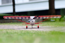 The two-piece all-balsa wing with a semi symmetrical airfoil uses a carbon tube joiner; the wing halves are secured with screws to the fuselage. The ailerons are controlled by a single micro servo each. The scale wing struts are secured with screws.