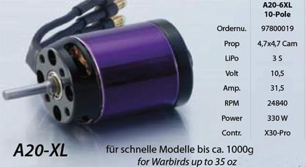 Außenläufer-Elektromotor A20-6 XL 10-Pole EVO kv2500 Beschreibung: Motor für schnelle Flugmodelle bis ca. 1kg