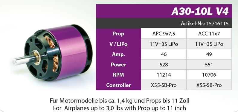 Außenläufer-Elektromotor A30-10 L V4 kv1185 Beschreibung: Motormodelle bis ca. 1,4 Kg