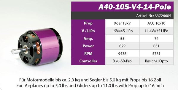 A40-10S-V4-14-Pole Artikel-Nr.: 33726605 Prop Xoar 13×7 ACC 16×10 V / LiPo 15V=4S LiPo 11,4V=3S LiPo Amp. 85 74 Power 829 831 RPM 9438 5781 Controller X70-SB-Pro Basic 90 Opto