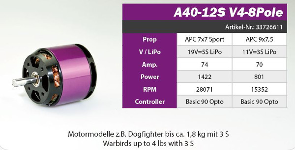 Aussenläufer – Elektromotor A40-12S V4 8-Pole kv1350
