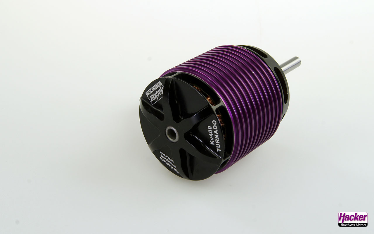 Hacker A50-14L Turnado V4 kv400 (mit langer Welle), Prop Adapter 6,0/8,0mm und Anleitung. Es können verschiedene Klappluftschraubenmittelteile passend zum Modell eingesetzt werden (siehe Reiter