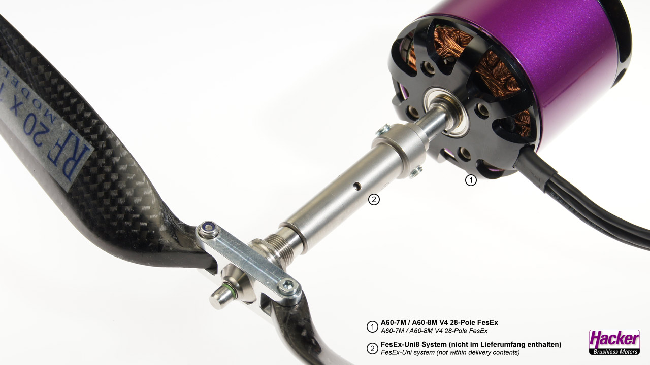 Durch seine spezielle Welle kann der Motor ohne weitere Änderung mit dem FesEx-Uni8 System (siehe Reiter Zubehör) ausgerüstet werden. Der Propeller kann damit dann mit nur einem Knopfdruck abgenommen werden, das Modell bleibt in seiner Erscheinug weiterhin ein vollwertiges Segelflugzeug. Der Wechsel zwischen eigenstartfähigem Fes-Modell zum reinen Segler gelingt in Sekunden.