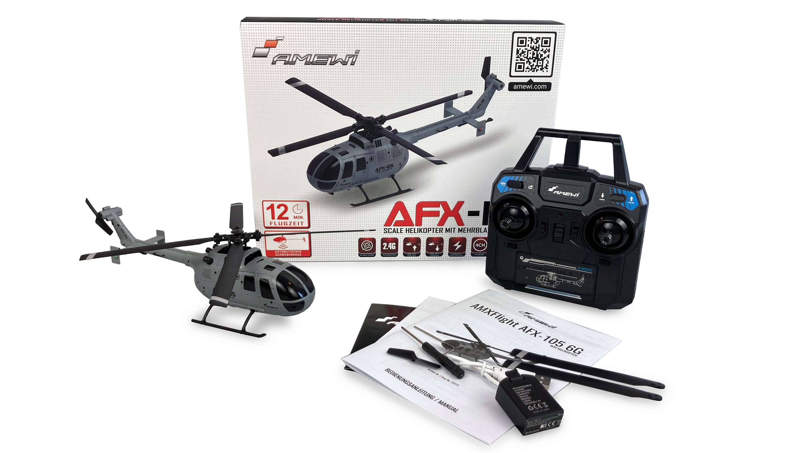 Die AFX-105 ist ein originalgetreuer Nachbau eines der bekanntesten Hubschrauber – der Bölkow Bo 105. Der gesamte Aufbau des Modells ist absolut hochwertig und robust gefertigt und überzeugt durch seine detailgetreue und gute Verarbeitung. Der neu konstruierte 4-Blatt Rotorkopf wird von einem präzisen Stabilisationssystem gesteuert und verleiht dem Modell dank Auto Start und Auto Landing ein völlig neues Steuergefühl! Somit ist es nun auch Einsteigern möglich ein Mehrblatt Helikopter ohne große Vorkenntnisse zu steuern. Über einen Knopfdruck am handlichen 2,4GHz Sender mit Metall Knüppeln lässt sich das Modell ohne Mühe auf eine gewisse Grundhöhe starten. Dort verweilt das Modell (Höhe halten Modus) und der Modellpilot kann sich somit auf die wesentlichen Funktionen des Helis konzentrieren, ohne auf die Höhe achten zu müssen. Das Gyro System steuert dabei zusätzlich im Hintergrund den Heckrotor und hält das Modell stabil in der Luft. Für mehr Agilität im Flug verfügt das Modell über 3 Geschwindigkeitsstufen, welche für Einsteiger und Fortgeschrittene gleichermaßen interessant sind. Somit ist das Modell auch voll Outdoor tauglich (bei leichtem Wind) und erreicht enorme Geschwindigkeiten im Vorwärtsflug. Zum Landen kann der Starten / Landen Knopf am Sender erneut betätigt werden und das Modell sinkt sanft zu Boden. Der Motor verfügt über Softanlauf und Soft Cut. Das bedeutet, beim Start dreht der Rotor langsam an und verhindert dadurch ein Wegdrehen des Modells um die eigene Achse. Dasselbe gilt bei der Landung, der Rotor läuft sanft aus und der Motor wird automatisch abgeschaltet. Als zusätzliches Sicherheitsfeature verfügt der Heli über eine Spannungsüberwachung, die den Akku im Flug permanent prüft. Ist die Grundspannung erreicht, fängt die LED im Heli an zu blinken und signalisiert damit, die Landung möglichst zeitnah anzustreben. Wenn der Pilot nicht reagiert, landet das System den Helikopter selbstständig, um den Akku zu schützen.