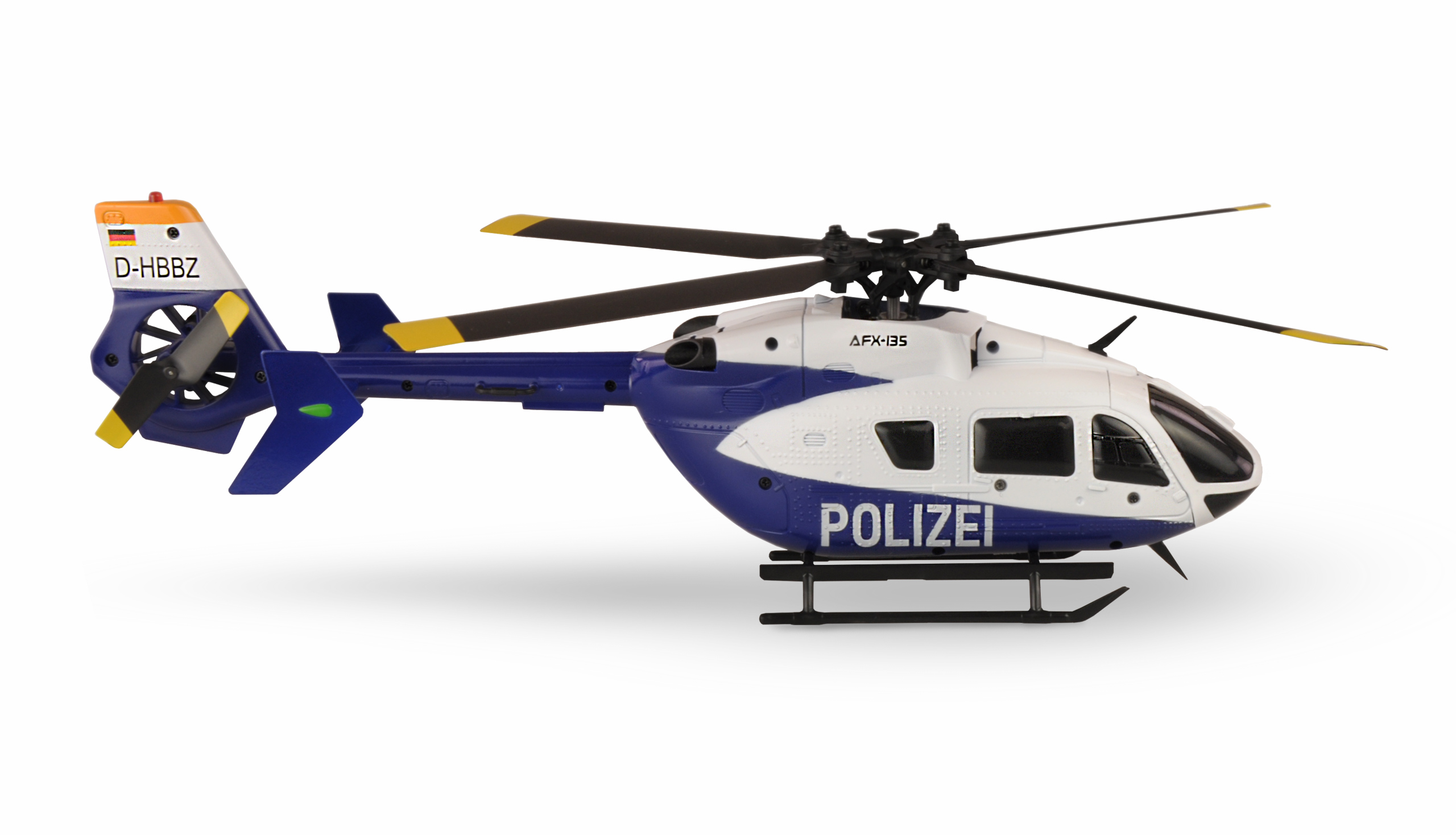 Super Scale Nachbau eines bekannten Hubschraubers mit Lackierung in den Farben der Deutschen Polizei – der AFX-135 weist dabei zahlreiche Details auf, die ganz dem Original entsprechen. Sogar die einzelnen Nieten der Kabine, die aus massivem Kunststoff hergestellt ist, werden dargestellt. Vorne wie hinten verfügt dieser Scale-Hubschrauber über eine LED-Beleuchtung, die die bestechende Optik abgerundet. Dank hochwertiger Elektronik inklusive Auto-Start und -Landung ist das Flugverhalten gutmütig und der Heli trotz Mehrblatt-Rotorkopf einsteigertauglich. Die Flugzeit beträgt etwa 7-9 Minuten mit dem integrierten, intelligenten Akku. Der besondere Clou dabei: Im Akku ist eine USB-Ladebuchse eingebaut, die einfach an das mitgelieferte USB-Kabel angeschlossen wird. Der Akku und das Modell verfügen über eine Überwachungsfunktion der Spannung (LED fängt an zu blinken, wenn die Spannung zu gering wird) So weiß der Pilot jederzeit Bescheid, wann besser der Rückflug zum Aufladen angetreten werden sollte. Der gut in der Hand liegende, hochwertige 2,4GHz Sender verfügt über drei unterschiedliche Flugphasen (von Einsteiger bis Fortgeschritten), Aluminiumknüppel und die Umstellmöglichkeit von Mode 2 (Auslieferungszustand) auf Mode 1. Der AFX-135 Polizei wird als RTF-Version (Ready-to-Fly) ausgeliefert, d.h. alle Komponenten – bis auf haushaltsübliche Batterien für die Fernsteuerung – sind bereits im Paket enthalten und der Heli kann nach Aufladen des Akkus sofort losfliegen.