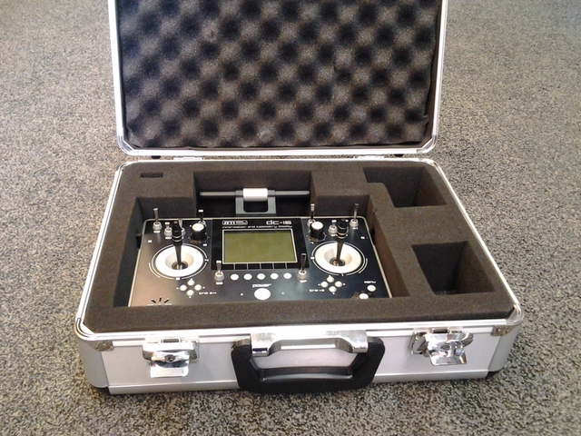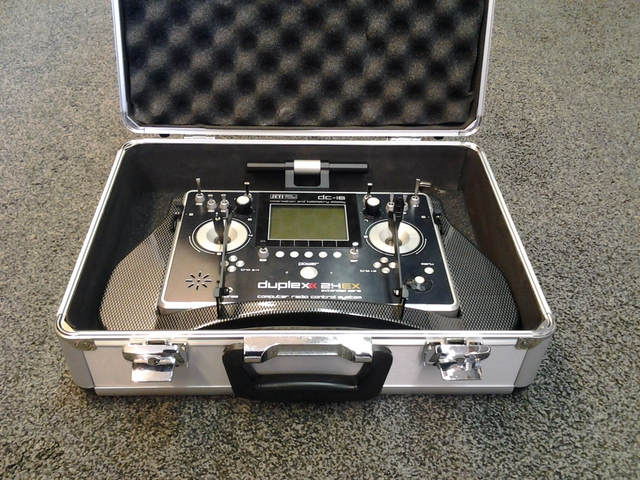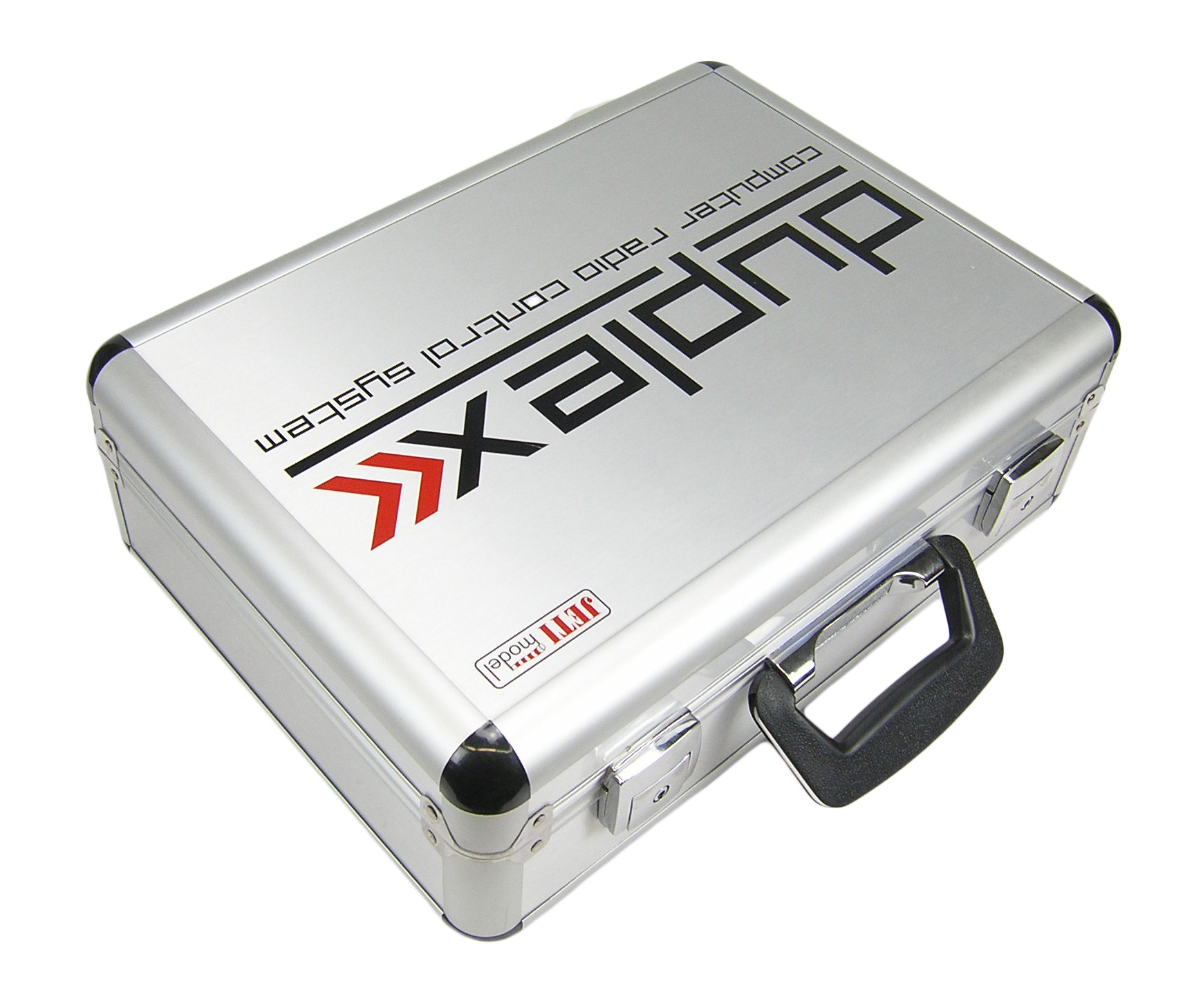 Senderkoffer aus Aluminium, bedruckt mit Jeti-Duplex Logo und abgestimmt auf JETI Pultsender