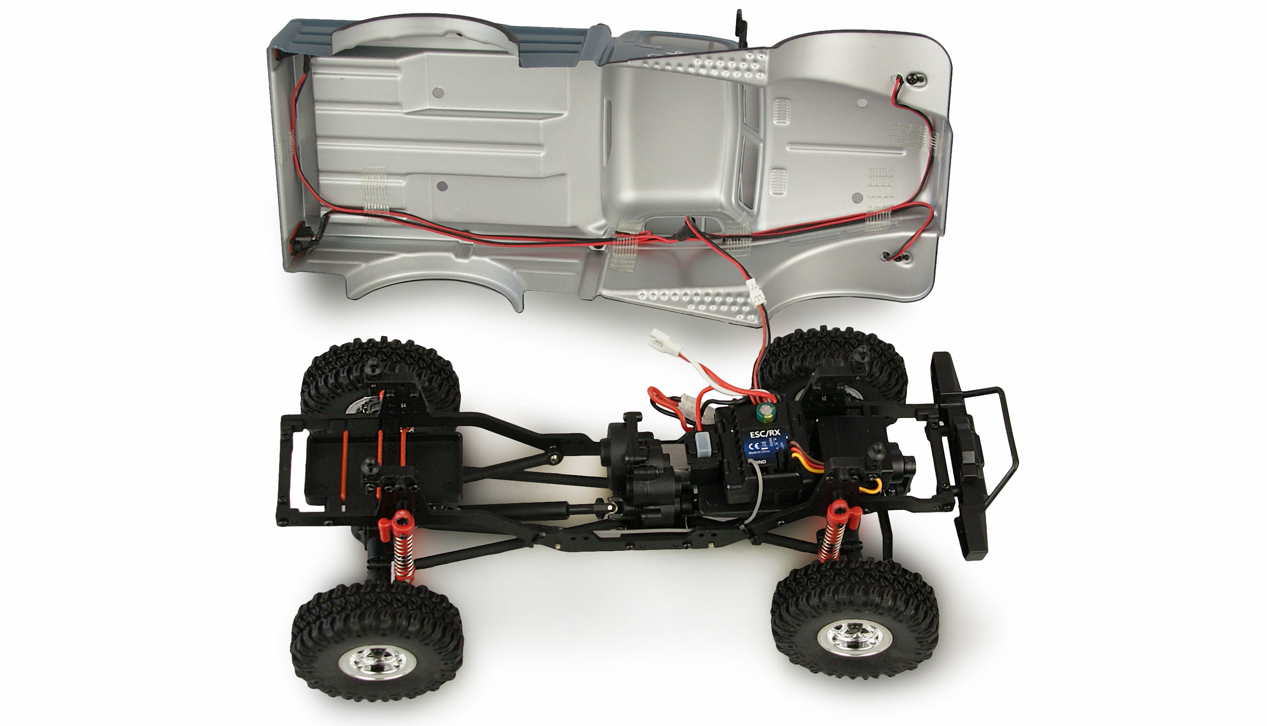 Als kleine Besonderheit sind beim Regler serienmäßig zwei weitere Ausgänge vorhanden, um z.B. eine Dachbeleuchtung oder eine FPV Cam anzuschließen. Die Leitungen sind bereits mit einem Micro JST Stecker versehen und anschlussfertig montiert. Ein Schnorchel an der Karosserie und viele weitere Scale Anbauten unterstreichen zusätzlich den kernigen Charakter des Fahrzeugs. Für lange Fahrzeiten von bis zu 15 Minuten sorgt der mitgelieferte LiPo Akku 2S 7,4V 600mAh. Dieser handelsübliche Akku ist wechselbar und verfügt über einen Molex-Anschluss sowie XH Balancer.
