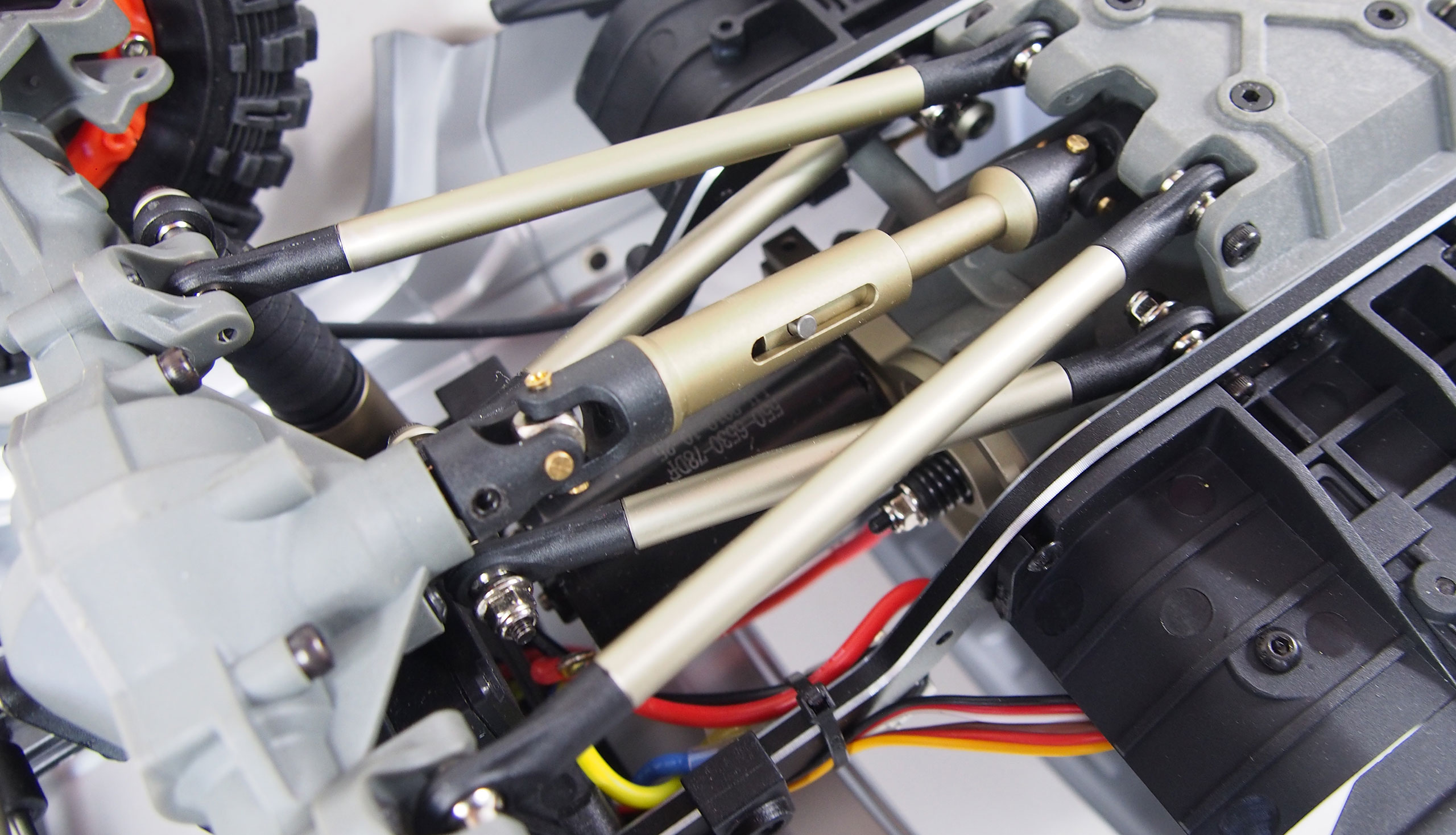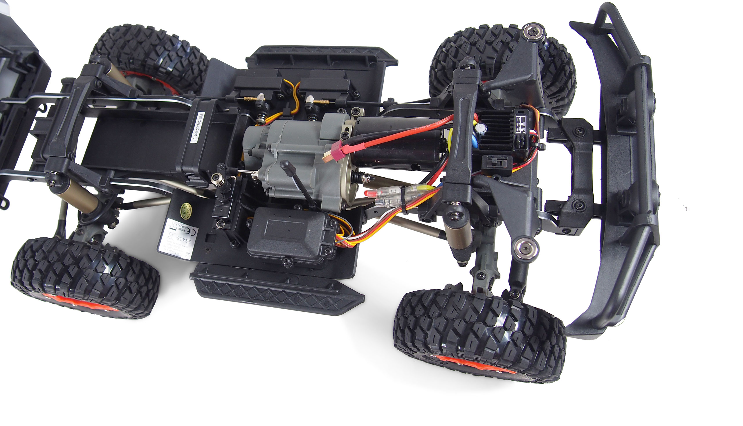 Dieser Top Crawler im Maßstab 1:10 vereint super Technik mit genialen Fahreigenschaften. Ausgestattet mit einem massiven 5mm starken Metallrahmen, Portalachsen, Aluminium Verstrebungen, hochwertigen, komplett geschützen Öldruck-Stoßdämpfern, 550er Bürstenmotor, einem gedämpften Lenksystem, über den Sender einzeln sperrbare Differentiale (vorne & hinten) und 2 – Gang Schaltgetriebe lässt diese Fahrzeug kaum Wünsche offen. Dieses Fahrzeug ist eine komplette Neuentwickelung und viele seiner Features sind zum ersten Mal in dieser Form auf dem Markt zu finden.Features:5mm CNC gefräster 6061 Alu RahmenCVD Antriebswellen12mm Aluminium RadmitnehmerMetall Teleskop AntriebswellenÜber den Sender einzeln sperrbare Differentiale vorne & hintenEinzigartiges Stoßdämpferdesign mit Staubschutzmanschetteneinzigartiges Lenkungsdämpfungssystempermanent gesperrte Achsen (Diffs)Einzigartiges 2 – Gang Schaltgetriebe mit Schutzfunktionhochwertige Karosserie mit Magnetverschluss 1,2mm PVC6 Kanal FernsteuersystemHobbywing WP-1060 ESC (Li-Po fähig) T-Stecker550 Crawler Motor brushedEinstellbare Alu-MotorhalterungCNC gefrästes MotorritzelLenkservo 9kg MetallgetriebeSchaltservo 0,9kg Schaltservo 2x 0,9kg (Differentiale)komplett kugelgelagertHigh Grip Super Soft ReifenAluminium LinksPortalachsen für erhöhte BodenfreiheitTechnische Daten:Länge: 530mmBreite: 220mmHöhe: 265mmRadstand: 313mmBodenfreiheit: min. 50mmRaddurchmesser: 110mmFelgendurchmesser: 62mmGewicht o. Akku: 2,74kgMotor: 550 brushedESC: Hobbywing WP-1060 (Li-Po fähig) T-SteckerFernsteuerung: 2,4GHz 4 KanalKarosserie: 1,2mm PVC lackiertRahmen: 5mm CNC Alu 6061Lieferumfang:Komplett montiertes Fahrzeug4x Reifen & Felgen 2,4GHz Fernsteuerung 6 KanalAnleitungBenötigtes Zubehör:Akku (Ni-Mh 7,2V oder Li-Po 7,4V)Passendes Ladegerät4x Batterie 1,5V AA Mignon für Sender
