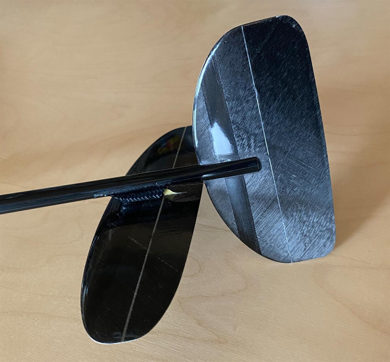 - bereits verklebte Seitenflosse mit angeschlagenem Ruder