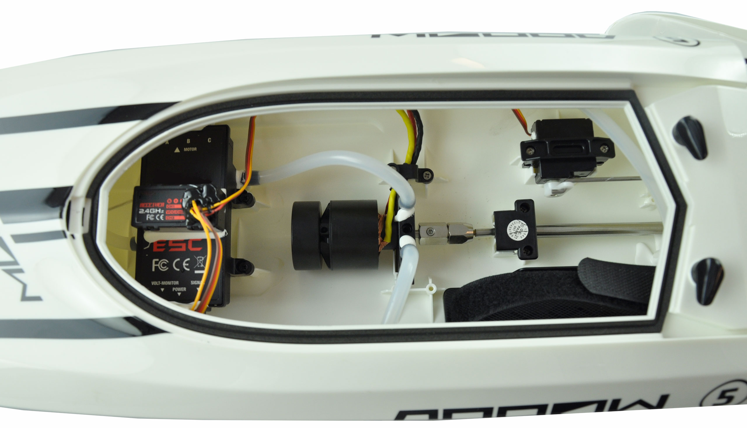 Ein Speedboot der Extraklasse mit einer absoluten Top-Ausstattung für das ultimative Highspeed-Erlebnis auf dem Wasser. Es ist alles enthalten, was zum Spaß haben benötigt wird: ein starker Brushless Motor, Wasserkühlung, ein störungssicheres 2,4GHz Steuersystem mit einer gut in der Hand liegenden Pistolenfernbedienung und einer wassergeschützten Elektronik. Der ebenfalls enthaltene 2200mAh LiPo Akku mit 11,1V sorgt für Fahrzeiten von 4 – 6 min. bei einem Topspeed von bis zu bis zu 50km/h. Für die Fahrstabilität dieses fantastischen Rennbootes sorgen die bereits fertig am Boot verbauten Trimmfinnen und Trimmplatten. Eine vollwertige servogesteuerte Ruderanlage geben Dir zusätzlich ein sicheres Gefühl und lassen Dich das Modell in rasanter Geschwindigkeit komfortabel um die Ecken jagen. Die integrierte Wasserkühlung sorgt dabei für einen sicheren Betrieb der Elektronik-Komponenten im Modell. Sollte dennoch mal ein Schaden am Propeller auftreten, liegt ein Ersatzpropeller dem Set bei, ebenso wie das dazugehörige Montage-Werkzeug. Der Rumpf ist aus sehr schlagzähem Kunststoff. Alles zusammen vermittelt einen extrem hochwertigen Eindruck, der durch das dynamische Weiß abgerundet wird. Für den Fall, dass Du dich mal festgefahren hast, verfügt das Boot auch über einen Rückwärtsgang (nur im Notfall, da über die Welle bei Rückwärtsmodus etwas Wasser durch die Welle in das Boot gesaugt wird).