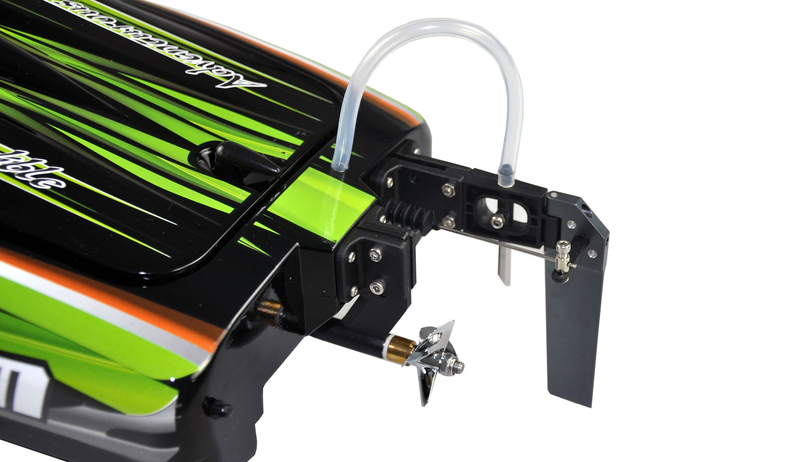 Schneller Rennkatamaran in absolut genialer Optik. Das Farbscheme überzeugt auf Anhieb und die komplette Ausstattung dieses Modells wurde auf den neuesten Stand der Technik gebracht. Der 2815 brushless Außenläufermotor bringt den Katamaran auf atemberaubende 60 – 65km/h “out of the Box” (Akkus nicht im Lieferumfang). Die mitgelieferte 2,4GHz Fernbedienung ist sehr feinfühlig und die Lenkauschläge lassen sich separat einstellen. Somit ist ein realistisches Fahrbild problemlos zu erreichen. Dieses tolle Rennboot überzeugt mit Leistung, Ausstattung und Optik.