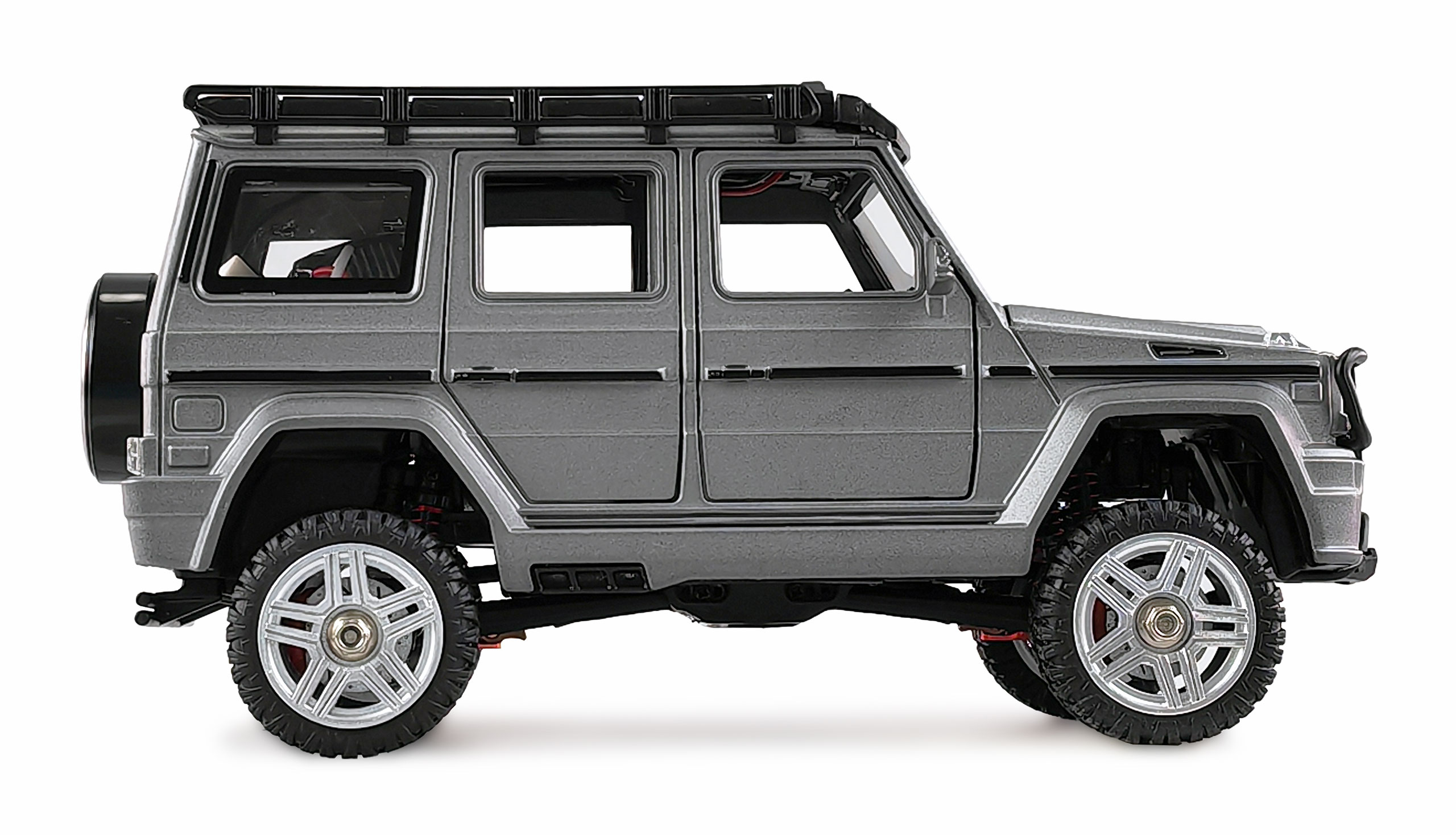 Alle Türen, die Heckklappe (Akkufach) und die Motorhaube mit Motorattrappe sind funktional und lassen sich öffnen. Der Innenraum ist detailliert ausgestattet z.B. mit Sitzen, Lenkrad uns Schalthebel. Der bereits fertig angebaute Dachgepäckträger kann problemlos für Zubehörteile wie z.B. Reservekanister, Erste-Hilfe-Boxen und Traktionsbleche o.ä. genutzt werden. Die handliche Fernsteuerung sendet im störungssicheren 2,4GHz Band. Alle Fahrfunktionen sind proportional.