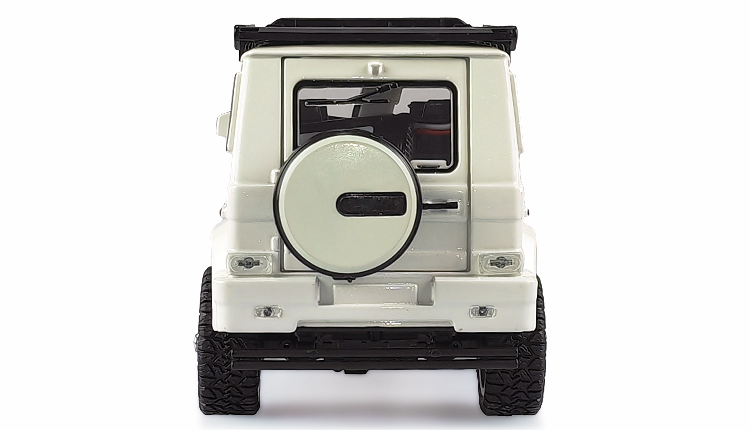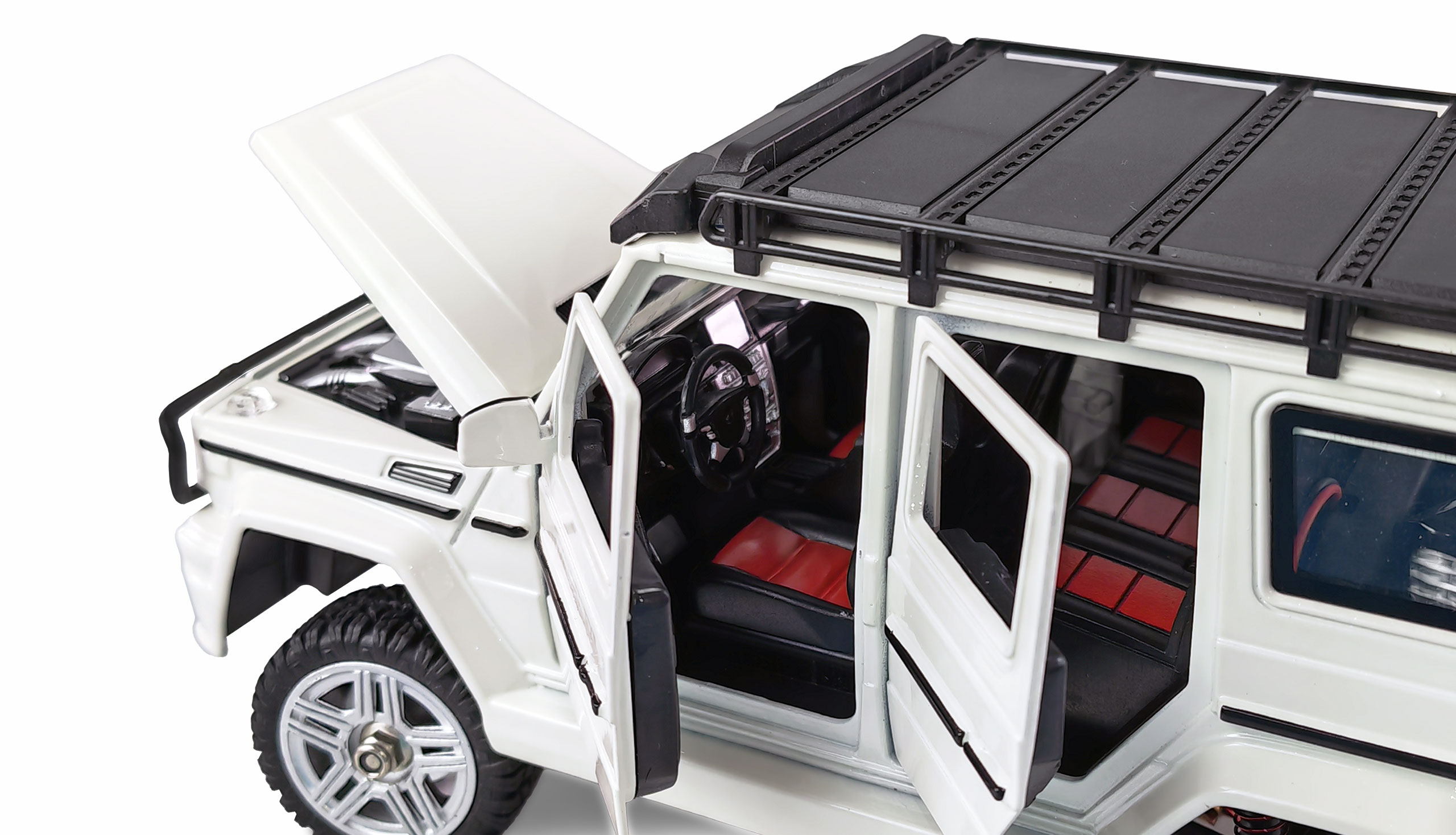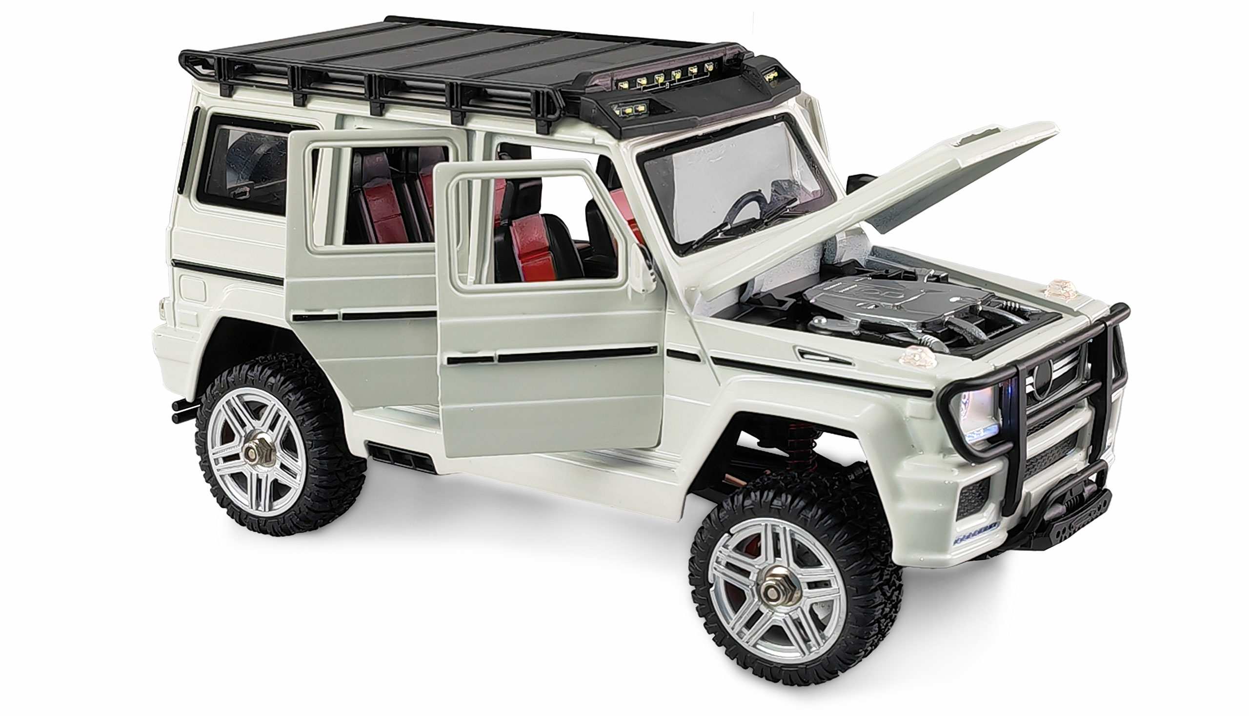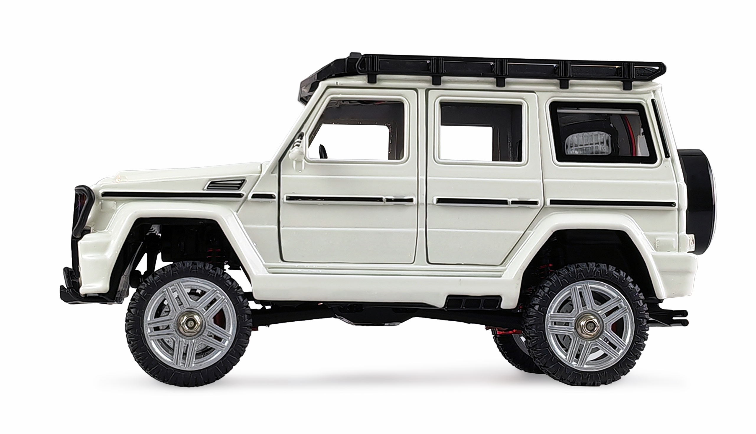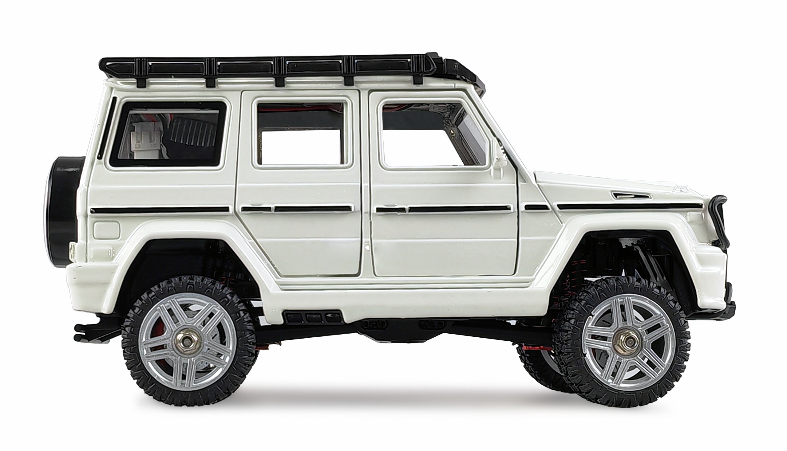 Alle Türen, die Heckklappe (Akkufach) und die Motorhaube mit Motorattrappe sind funktional und lassen sich öffnen. Der Innenraum ist detailliert ausgestattet z.B. mit Sitzen, Lenkrad uns Schalthebel. Der bereits fertig angebaute Dachgepäckträger kann problemlos für Zubehörteile wie z.B. Reservekanister, Erste-Hilfe-Boxen und Traktionsbleche o.ä. genutzt werden. Die handliche Fernsteuerung sendet im störungssicheren 2,4GHz Band. Alle Fahrfunktionen sind proportional.