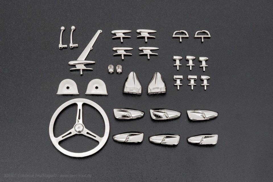 Beschlagteilesatz mit einem hochwertig verchromten, hochglänzenden Finish. Die Beschlagteile sind im Maßstab 1:6 und als Satz passend zu unserer Modellyacht Comtesse ausgelegt. Dieser Satz passt auch auf andere Mahagoni-Yachten im gleichen Maßstab. Die Lieferung erfolgt in einer schönen Klarsichtbox.