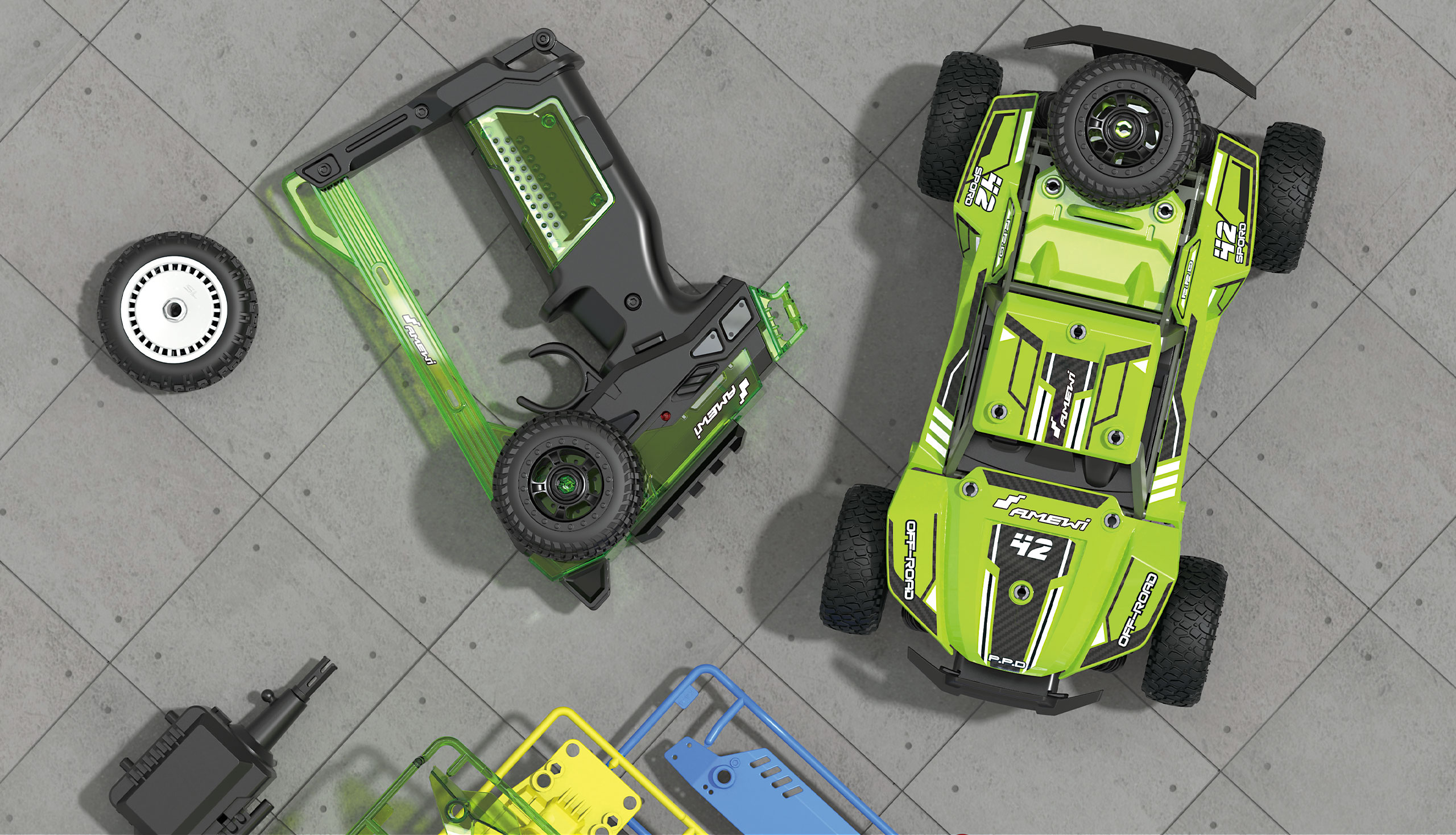 Bausatz eines coolen 2WD-Racers im Maßstab 1:18, der Aufbau- und Fahrspaß miteinander kombiniert. Das 72-teilige Modell ist dank intelligentem Stecksystem komplett ohne Werkzeug innerhalb von 30min montierbar und hält ganz ohne Klebstoff. Der gesamte Aufbau und die Karosserie bestehen aus festem ABS-Kunststoff. UV-beständige Aufkleber mit trendigen Mustern verleihen dem Frog bei Bedarf eine individuellere Optik. Mit Reifen aus einer High-Grip Gummimischung, Stoßdämpfen und Spritzwasserschutz ist das Modell ebenso outdoortauglich und macht auch im Gelände eine gute Figur. Der Buggy erreicht eine Höchstgeschwindigkeit von ca. 8m/h. Eine moderne 2,4GHz Pistolenfernsteuerung ist bereits im Lieferumfang enthalten. Für die Inbetriebnahme des Modells werden lediglich noch haushaltsübliche Batterien für das Fahrzeug und die Fernsteuerung benötigt.