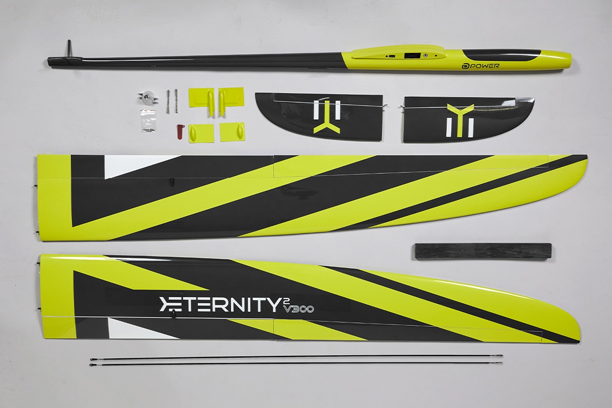 Gefertigt ist der E-TERNITY² V300 aus einem in der Form lackierten GFK-Rumpf. Auch die Tragflächen und die V-Leitwerke sind vollständig aus GFK. Zusätzlich sind Bauteile mit einer besonders hohen Belastung mit Carbon verstärkt. Die eingebaute MULTIlock®-Tragflächenverriegelung gibt den Flächen zusätzlichen Halt und dank der eingebauten MPX-Hochstromstecker lassen sich die Flächen schnell demontieren.