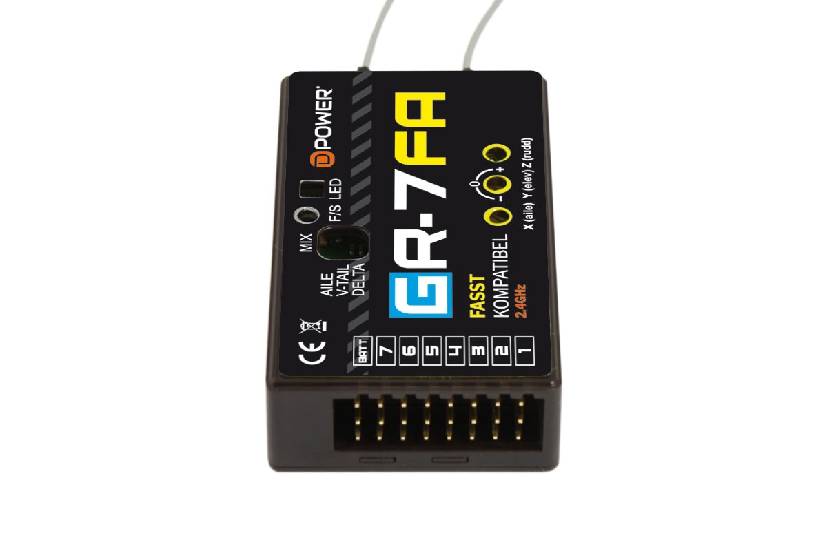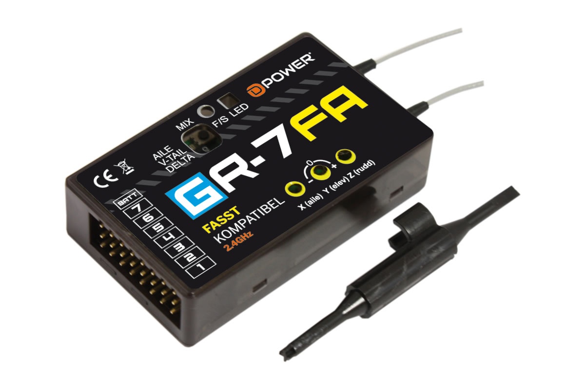 Der neue Empfänger mit 3 Achsen Gyro-Funktion aus der D-Power Serie ist voll kompatibel zur Robbe / Futaba FASST Technology. Der Integrierte 3 Achs Gyro unterstütz die Quer, Höhe und Seitenruder Funktion. Natürlich können auch Modelle mit 2 Querrudern, Delta und V-Leitwerk Funktion betrieben werden. Dafür werden die Mixer einfach mit einem kleinen integrierten Schalter aktiviert. Die Gyro-Empfindlichkeit kann stufenlos bei allen 3 Achsen eingestellt werden. Nach modernsten Standards gefertigt, besitzt der G-R7FA Empfänger eine Failsafe-Funktion.