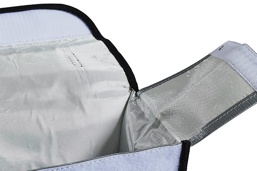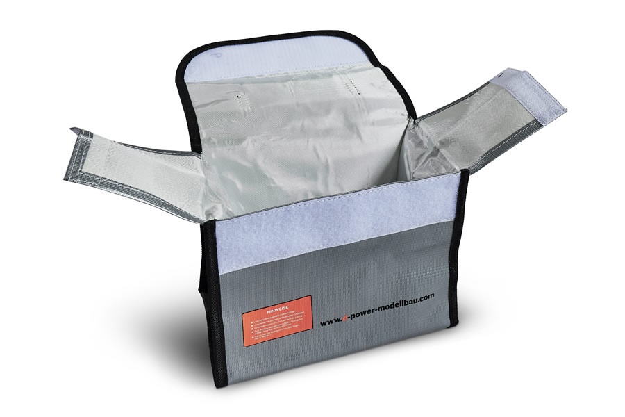 LiPo Tasche mit Tragegriff zur sicheren Aufbewahrung von LiPo Akkus, um im Falle eines Akku-Brands ein Übergreifen des Feuers zu verhindern. Das hochwertige engmaschige Fiberglas-Gewebe hält dabei Temperaturen von bis zu 1000° Celsius aus.