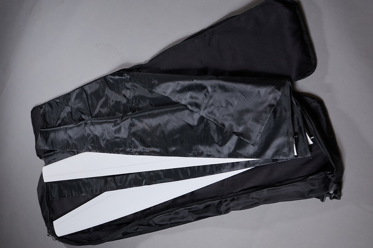 Die Flächen finden Platz in einem großen Einlegefach (ca. 140 x 34 cm), welches mit einem umlaufenden Reißverschluß verschlossen werden kann. Das Einlagefach ist so unterteilt, dass sich bis zu vier Flächenhälften während des Transports nicht berühren können und somit optimal geschützt sind.