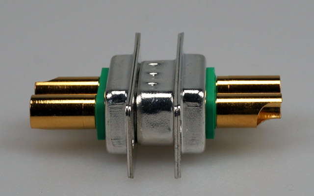 D-Sub-Verbinder mit zwei Pins z. B. für die Spannungsversorgung. Zur Befestigung der Kabel sind auf der Rückseite der Verbinder Lötkelche angebracht.