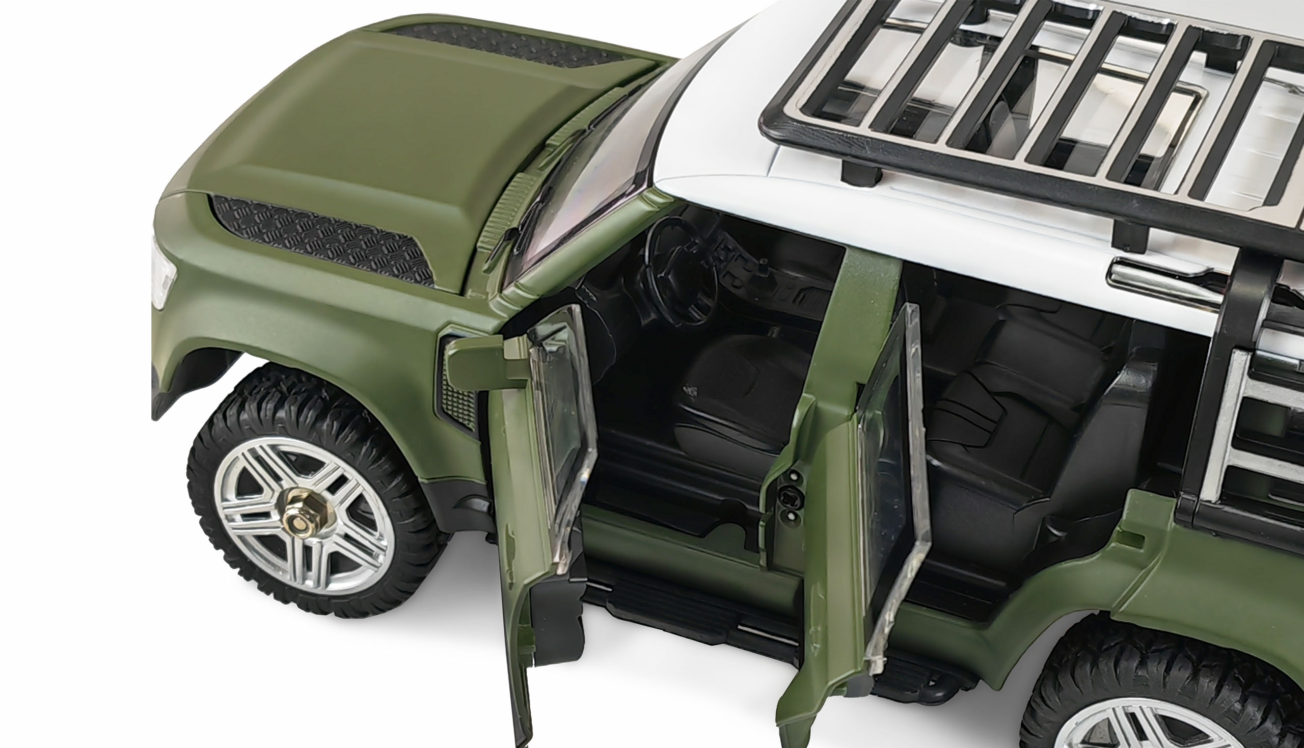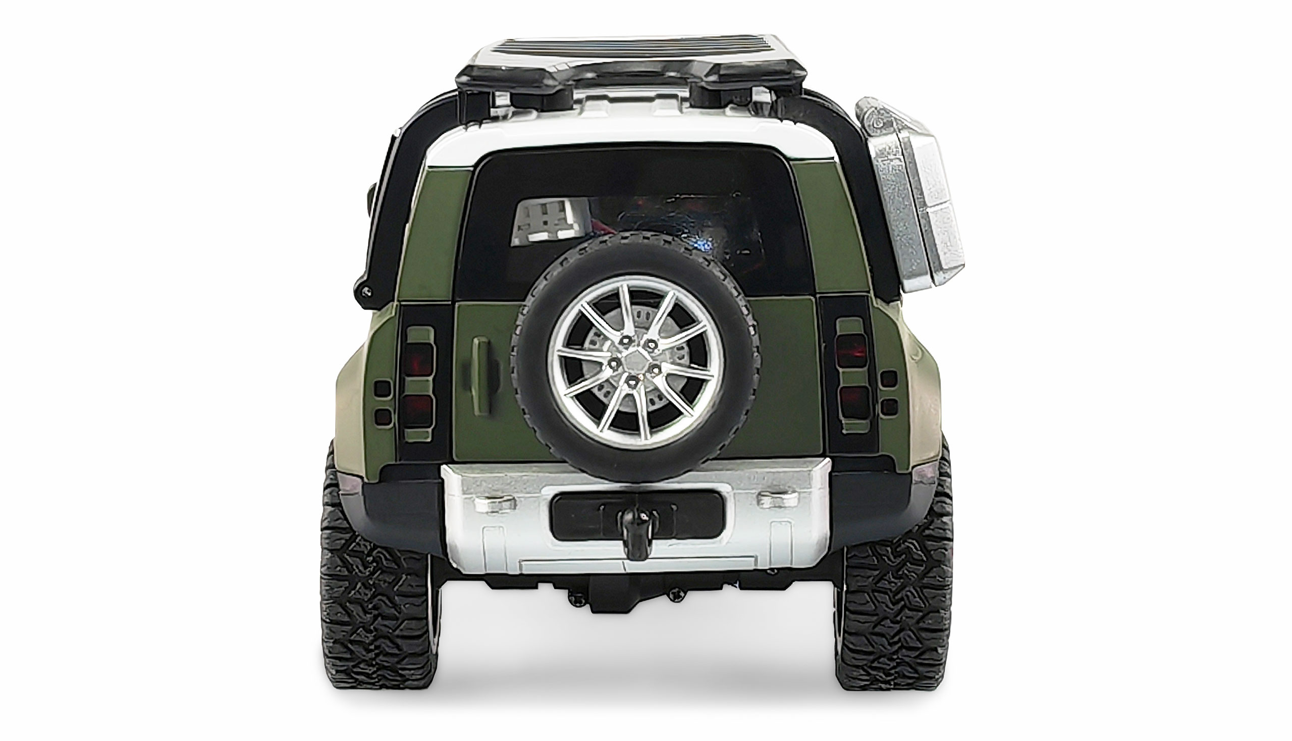 Alle Türen, die Heckklappe (Akkufach) und die Motorhaube mit Motorattrappe sind funktional und lassen sich öffnen. Der Innenraum ist detailliert ausgestattet z.B. mit Sitzen, Lenkrad uns Schalthebel. Der bereits fertig angebaute Dachgepäckträger kann problemlos für Zubehörteile wie z.B. Reservekanister, Erste-Hilfe-Boxen und Traktionsbleche o.ä. genutzt werden. Die handliche Fernsteuerung sendet im störungssicheren 2,4GHz Band. Alle Fahrfunktionen sind proportional.