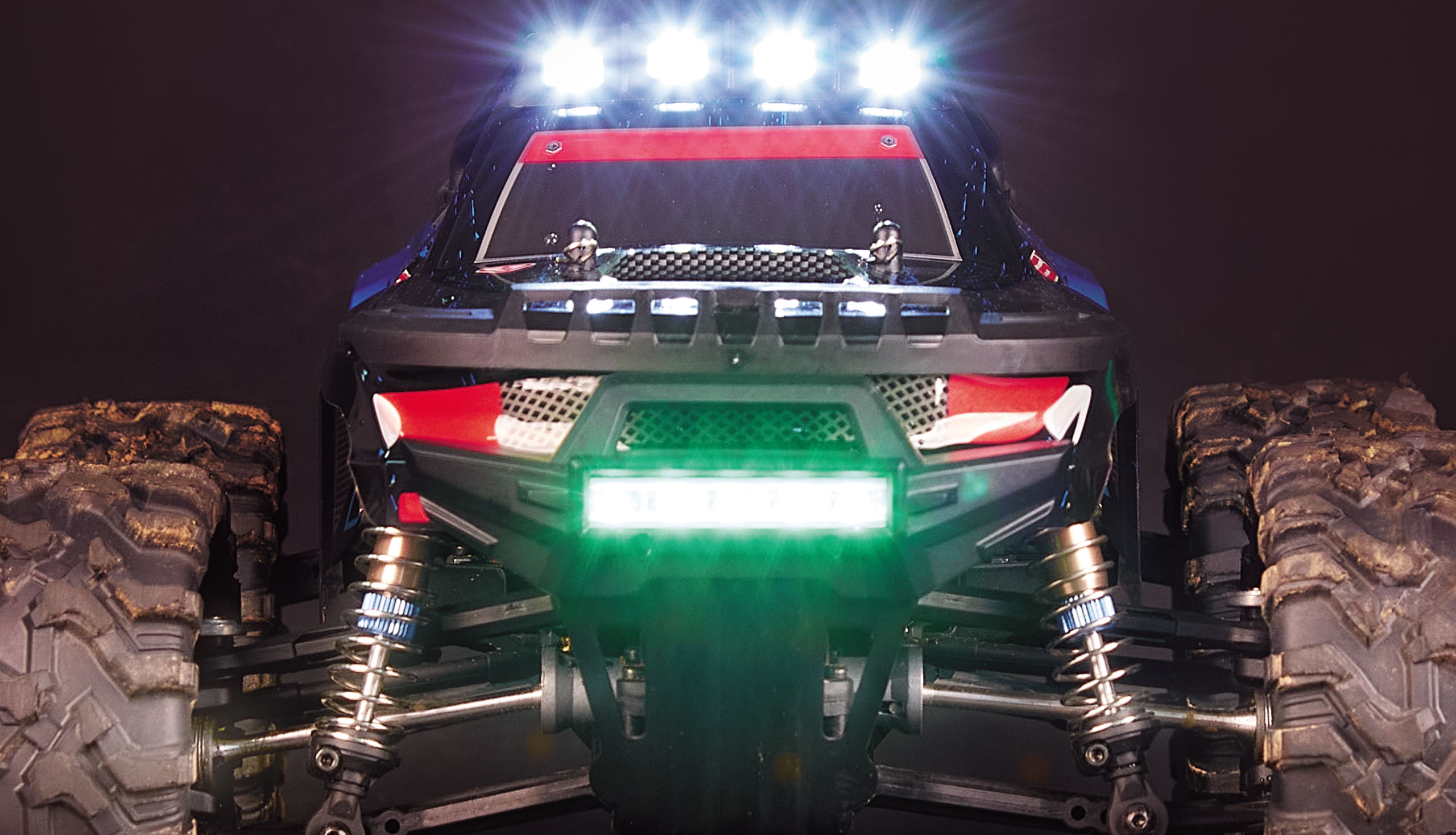 Auch die weiteren Features wissen zu überzeugen: Die Öldruckstoßdämpfer, übergroßen Reifen, das Fahrwerk, die Metall-CVD-Antriebswellen vorne, Metallantriebswellen hinten, Metall Kardanwellen, Metallbodenplatte und die Metallgetriebe im Fahrzeug sorgen für eine lange Haltbarkeit. Eine komplett schaltbare und helle LED-Beleuchtungsanlage (vorne, hinten, Dach) runden das gesamte Paket ab. Als optischer Aspekt wurde das Modell rundherum mit Bremsscheiben-Attrappen ausgerüstet. Ein zusätzlicher Pluspunkt ist das Sende- / Empfangssystem in 2,4GHz, das bereits komplett eingestellt ist. Über einen frei belegbaren, vierten Kanal verfügend können Zubehörteile verwendet werden. Zur Sicherheitsausstattung des Modells gehört unter anderem eine Akku-Überwachung, welche sich bei Unterspannung lautstark bemerkbar macht und das Fahrzeug bei Nichtbeachten in den Ruhemodus versetzt. Die gesamte Elektronik und auch das Servo ist vor Spritzwasser geschützt. Einem Einsatz im harten Outdoor-Gelände sind somit kaum Grenzen gesetzt.