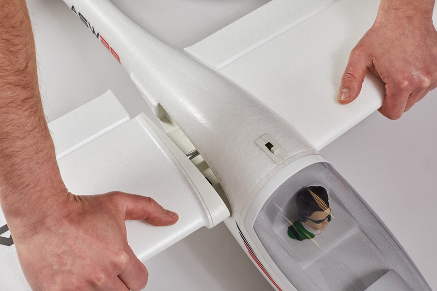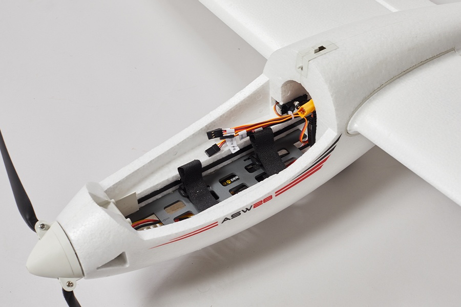 Die ASW-28 kommt in der PNP-Version mit fertig eingebauter Elektronik aus der Box. Für ordentlich Steigleistung sorgt der 3542-850KV Brushless-Motor in Verbindung mit einem 40A Regler. Eine effektive Kühlung der Elektronik ist durch die Lufteinlässe an der Nase und große Luftauslässe an der Unterseite des Rumpfes gewährleistet. Die effiziente Klappluftschraube bringt die Leistung in die Luft. Unter der verriegelbaren Kabinenhaube findet ein 3-4S Akku seinen Platz. Ein 2200-3300mAh Akku sorgt dabei für etwa 10 bis 15 Minuten reinsten Flugspaß.
