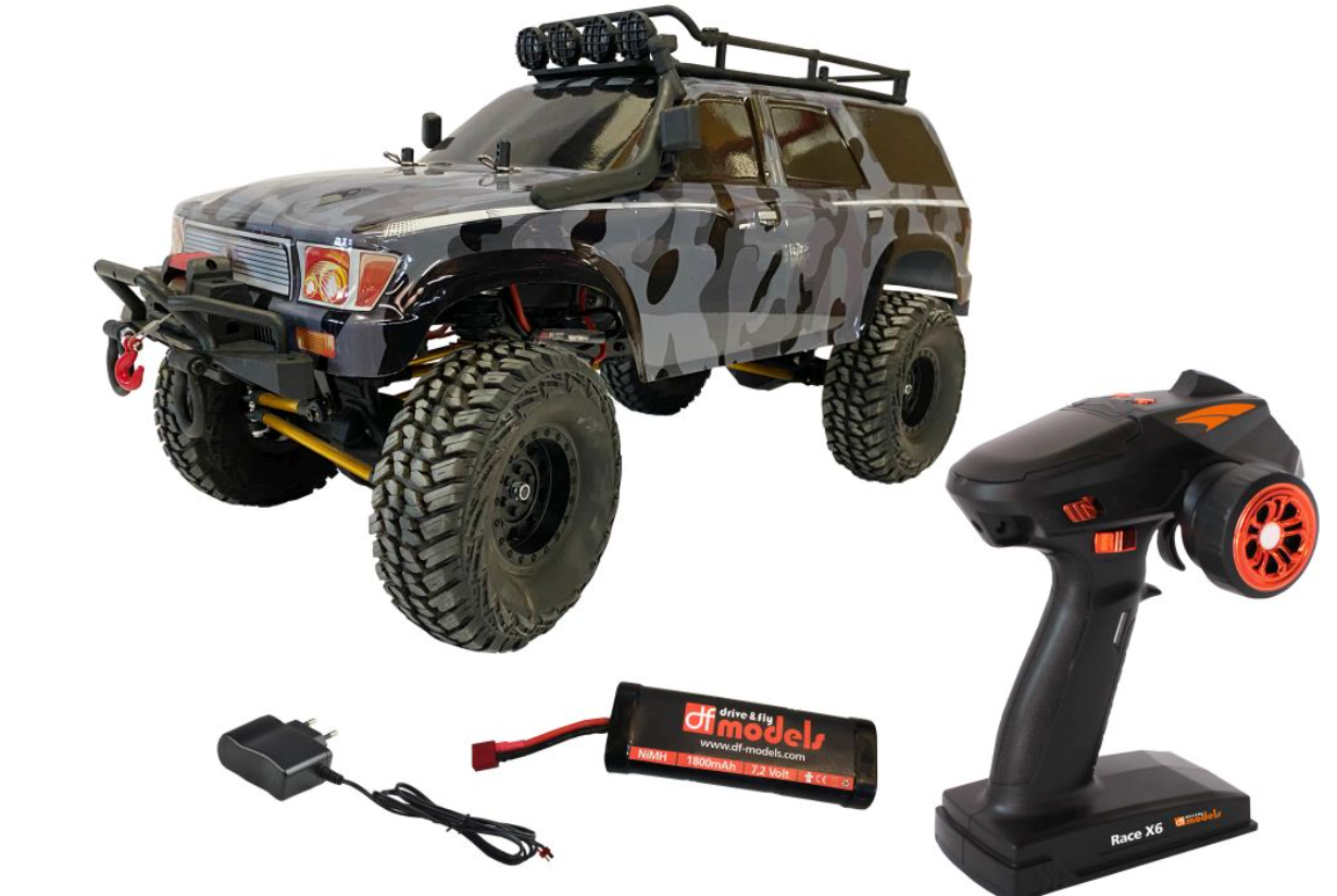 Die Beliebtheit von Crawler-RC-Modellen ist ungebrochen. Der neue DF-4S Scale-Crawler 313mm 2023 Edition hat ein Metallrahmenchassis, Differentialsperren, Super-Torque-Crawler Motor und einen speziellen, LiPo fähigen Crawler-Regler. Ein 2-Gang-Schaltgetriebe sowie eine elektrische Seilwinde runden das Modell ab. Über die 5-Kanal-Anlage lassen sich die LED-Beleuchtung ein-/ ausschalten, das 2-Gang-Schaltgetriebe bedienen und die Seilwinde vor und zurück steuern. Zudem verfügt die 5-Kanal-Anlage über eine Dual-Rate-Funktion für den Gas-Kanal (Maximalgeschwindigkeit kann so von 100 – 0 % stufenlos eingestellt werden). Es sind bereits viele Aluminiumteile verbaut. Die Karosserie ist höhenverstellbar, um diese so auf die individuellen Bedürfnisse anzupassen. Extrem geländegängig, lange Fahrzeit (bis zu 60 Minuten) und Supersoftreifen lassen das Crawler-Herz höherschlagen.