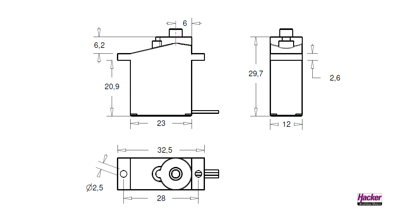 Micro-Servo mit Kunststoffgehäuse und Metallgetriebe.
