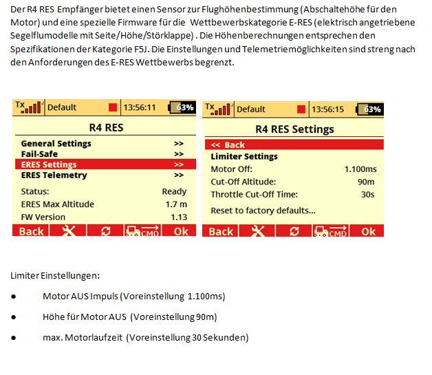Der R4 RES Empfänger ist speziell für ERES-Wettbewerbe (elektrisch angetriebene Segelflugzeuge der Klasse RES) ausgelegt. In dieser Wettbewerbskategorie gelten die gleichen Vorgaben für Motorlaufzeit und maximale Steigflughöhe wie in der F5J Klasse. Die Einstellungen sowie Telemetrie dieses Empfängers sind nach den ERES-Vorgaben begrenzt.