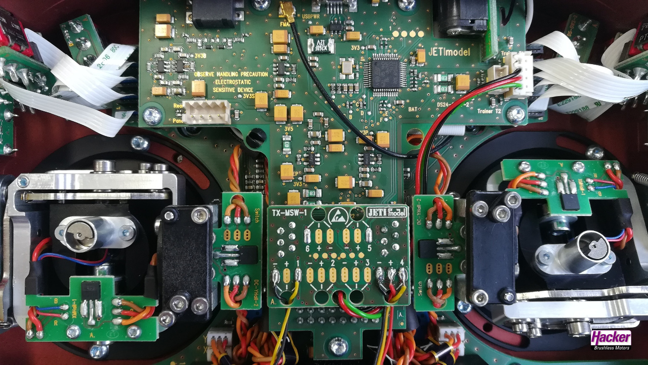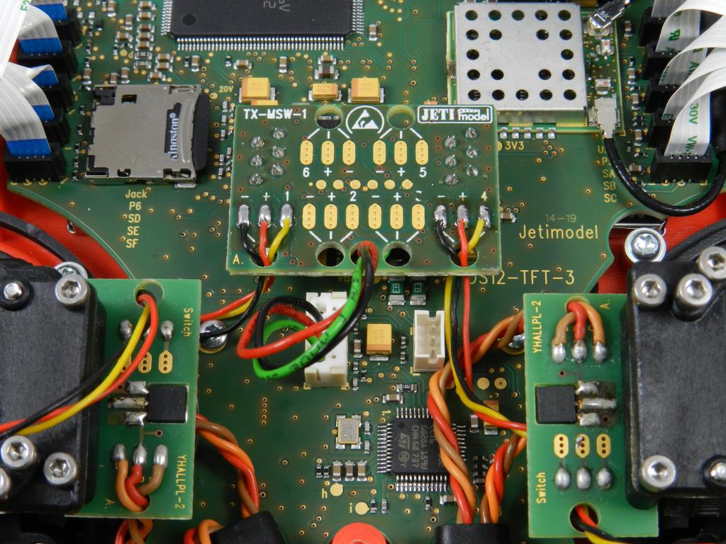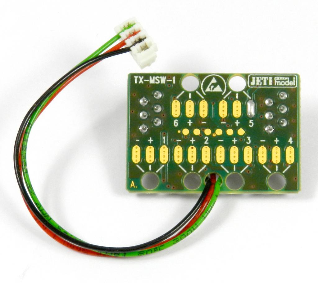 Das DUPLEX 2.4EX MSW-Erweiterungsmodul für DC/DS-Sender ermöglicht den Anschluss von bis zu sechs weiteren Gebern/Schaltern, wie z. B. Knüppelschaltern. Dieses Erweiterungsmodul ist für alle JETI Duplex DC/DS-Sender ausgelegt.