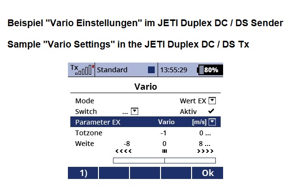 Die Signalisation über Steigen oder Sinken des Modells wird über das im Sender eingebaute HF Modul ausgegeben, bzw. an der mit dem Sendermodul verbundenen Jetibox angezeigt.