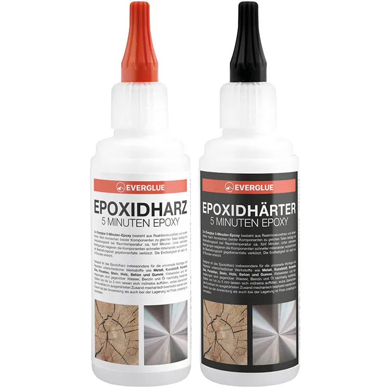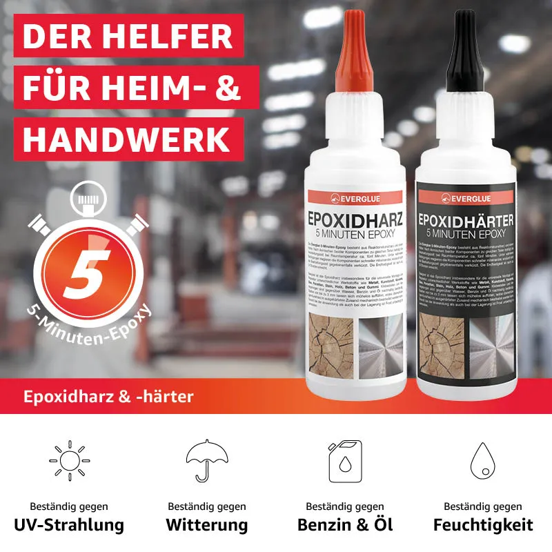 Der Everglue 5-Minuten-Epoxy ist ein hochleistungsfähiger, lösungsmittelfreier 2K Epoxidharz-Kleber, der auf einer Basis von Reaktionskunstharz und Härter entwickelt wurde. Dieser transparente Epoxidkleber eignet sich perfekt für die universelle Montage, Reparatur und Oberflächenversiegelung verschiedenster Materialien wie Metall, Kunststoff, Styropor®, Keramik, Glas, Porzellan, Stein, Holz, Beton, Pappe, Fliesen und Gummi. Dank seiner herausragenden Beständigkeit gegen Wasser, Benzin und Öl bleibt der Everglue 5-Minuten-Epoxy auch im ausgehärteten Zustand dauerhaft stabil und zuverlässig. Dies macht ihn zum idealen 2-Komponenten-Kleber für anspruchsvolle Anwendungen, bei denen eine hohe Belastbarkeit erforderlich ist, wie etwa zum Füllen von Rissen im Holz mit Epoxidharz.