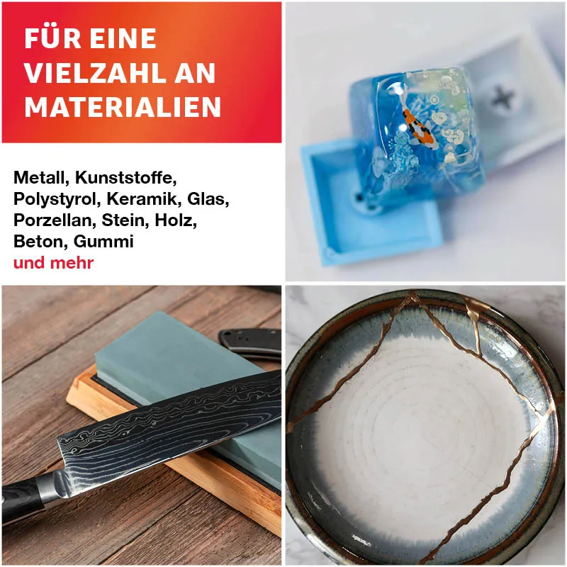 - Modellbau: Perfekt für detaillierte und präzise Arbeiten im Modellbau, wo schnelle Aushärtung und hohe Festigkeit gefragt sind. Ideal für das Kleben von Keramik wasserfest.