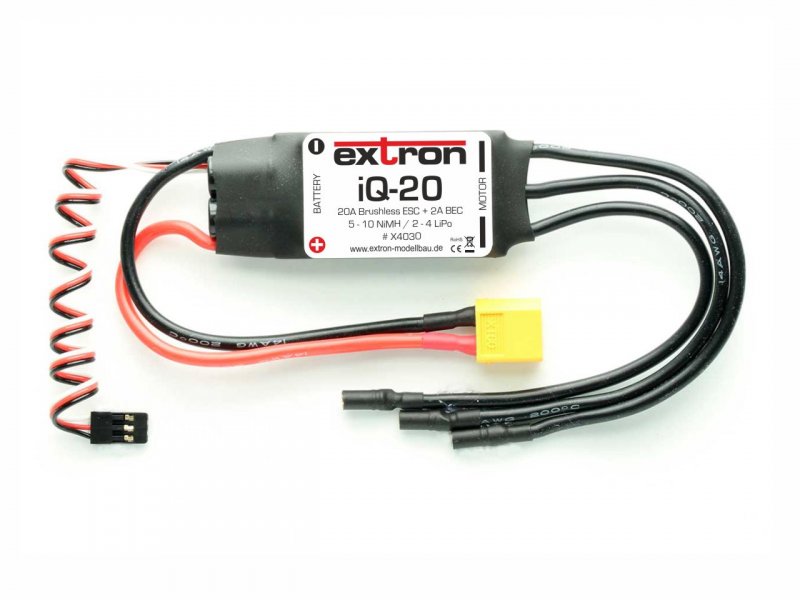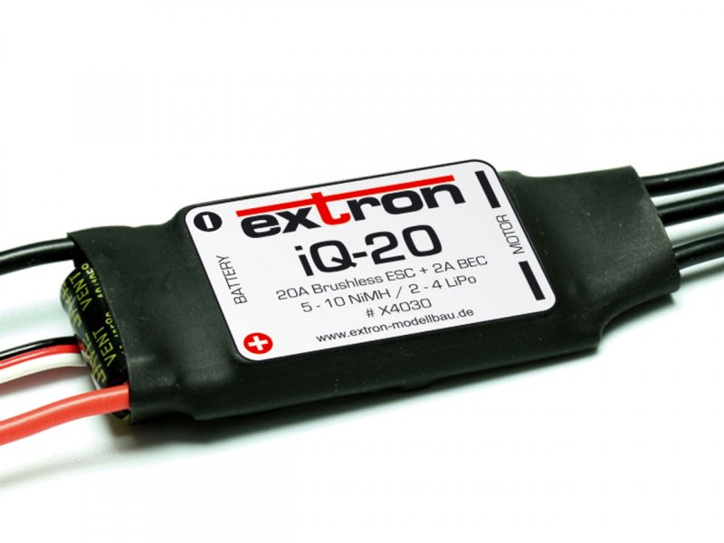 Extron iQ Brushless Regler überzeugen durch hohe Qualität, Leistung und Zuverlässigkeit. Sie passen perfekt zu allen handelsüblichen Brushless Motoren (Außenläufer oder Innenläufer) und sind natürlich auch die erste Wahl für Extron Brushless Motoren. Als Akkus können entweder LiPo, NiMH oder NiCD Akkus eingesetzt werden. Die Zellenzahl wird automatisch vom Regler erkannt. Dank Einsatz moderner, hochwertiger SMD Bauteile ist der Innenwiderstand der Regler besonders niedrig. Die hohe Taktfrequenz ermöglicht ein hochauflösendes und feinfühliges Regelverhalten.