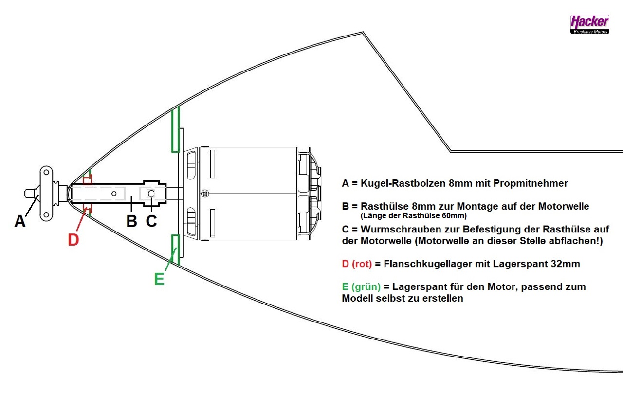- Mindestabstand Modellnase > Motorspant (Länge der Rasthülse): 60mm