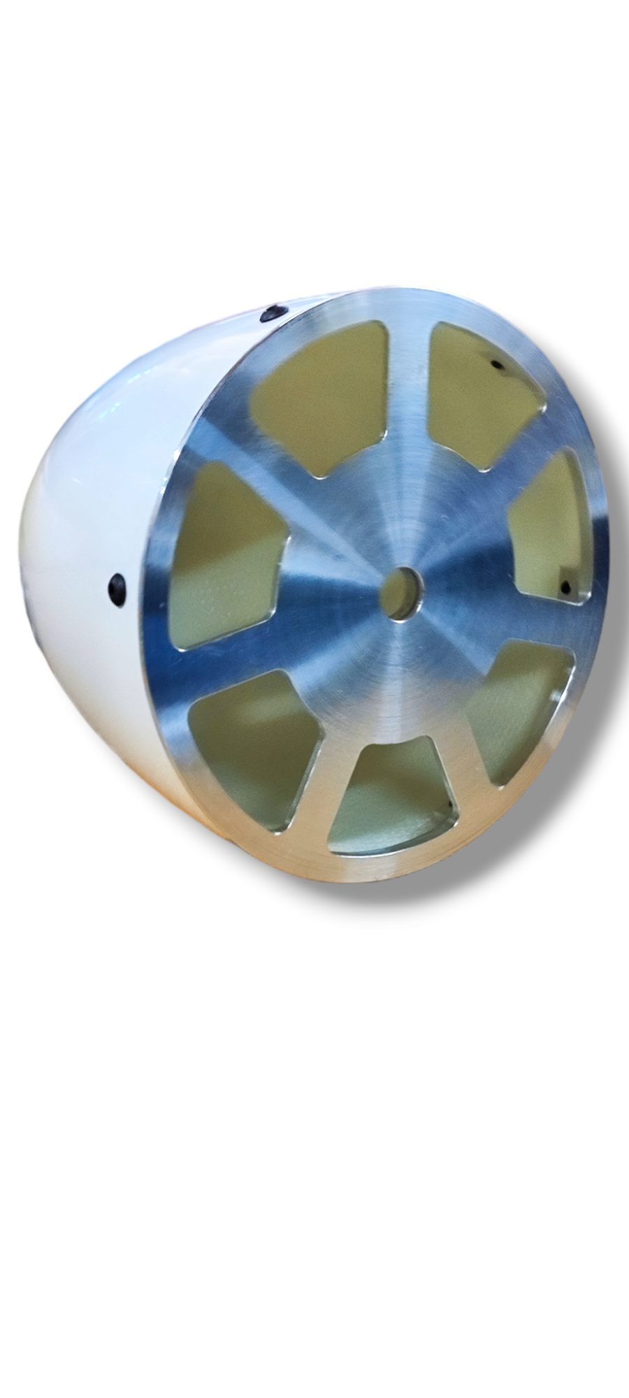 Lightweight, well balanced and electric starter resistant! Machined aluminium plate, fiberglass spinner gelcoated fixed by 6x M 3 screws at the circumference. Fit as well as 2, 3, 4 bladed props as the slots had to be cut according to the propeller used.