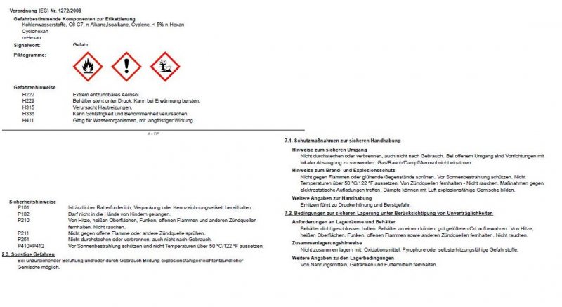 Bei unzureichender Belüftung und/oder durch Gebrauch Bildung explosionsfähiger/leichtentzündlicher Gemische möglich.