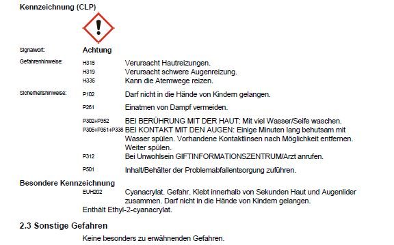 EUH202 Cyanacrylat. Gefahr. Klebt innerhalb von Sekunden Haut und Augenlider zusammen. Darf nicht in die Hände von Kindern gelangen. Enthält Ethyl-2-cyanacrylat.
