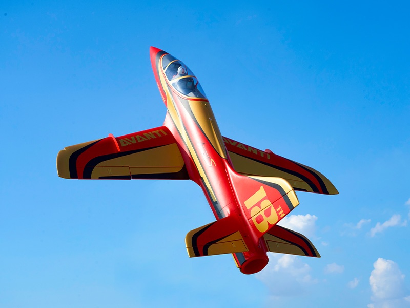 Das Jet Modell ist gefertigt aus extrafestem und besonders leichtem EPO Hartschaummaterial. Die komplette Elektronik wie Motor, Impeller, Regler und 8 präzise Metallgetriebe-Servos, sowie die Navigationslichter sind bereits fertig im Modell verbaut. Darüber hinaus verfügt die Avanti 90mm über die neuesten Struktur- und Montagetechniken, wie z.B. die verschraubte Struktur, die kugelgelagerten Steuerflächen und das Multi-Verbindungssystem, das eine schnelle und einfache Montage ermöglicht. Ausgestattet mit einem elektronischen Einziehfahrwerk mit Überstromschutzmodus und einem CNC-gefrästen Knicklandefahrwerk aus Metall, absorbiert die Avanti auch heftige Landungen. Die großen, verschleißfesten Reifen ermöglichen dabei Starts und Landungen auf rauen Oberflächen. Die vier Navigationslichter sind auf beiden Flügelspitzen sowie auf dem oberen und unteren Rumpf verteilt, wobei sowohl die Flügelspitzen- als auch die untere Rumpfbeleuchtung blinken können, was den Flügen vor dem Hintergrund der untergehenden Sonne mehr Realismus verleiht.
