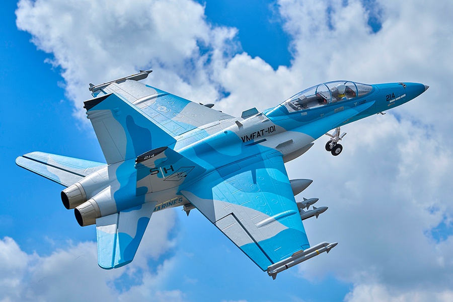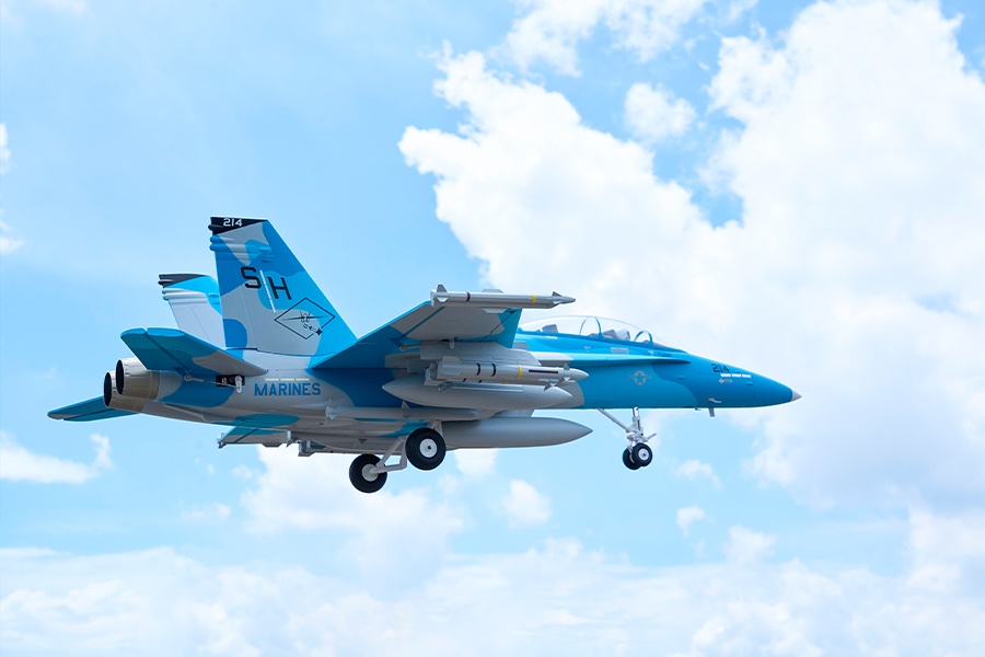Die F-18 von FMS ist ein originalgetreuer RC-Jet aus EPO-Hartschaumbauweise. Das Modell kommt nahezu flugfertig aus der Box – inklusive zahlreicher Scale-Details, einem robusten Fahrwerk, einem effizienten 12-Blatt-Impeller und funktioneller Beleuchtung.