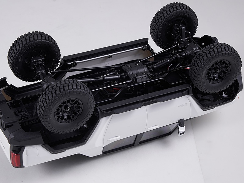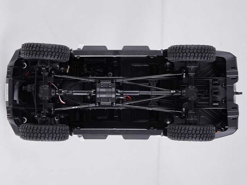 Um die Geländetauglichkeit und das Fahrverhalten des Originalfahrzeugs originalgetreu nachzubilden, hat FMS bemerkenswerte Fortschritte erzielt, indem das FCX18-Chassis vom Chassis der FCX24-Serie abgeleitet wurde. Das FCX18-Chassis verfügt über eine Metallträgerkonstruktion sowie Metallträger (4 Stück) und Lenkstangen (2 Stück), die auch unter extremen Bedingungen leistungsfähig sind. Die mittig montierte Antriebseinheit hat einen niedrigen Schwerpunkt und umfasst ein 2-Gang-Getriebe, ein Verteilergetriebe und einen 180er-Bürstenmotor. Die Kraft wird über die Kardanwelle auf die Vorder- und Hinterachse übertragen. Die Achsen sind mit Radseitenreduzierern ausgestattet, die gemeinhin als “Portalachsen” bezeichnet werden und die Bodenfreiheit der Differentialzahngruppe erhöhen und die Befahrbarkeit verbessern.