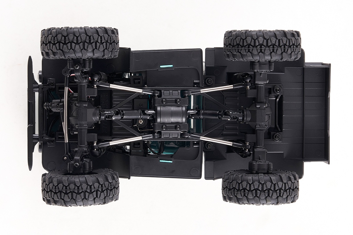 Die mittig montierte Antriebseinheit (2-Gang-Getriebe, Verteilergetriebe und Brushless Motor) ermöglicht einen sehr niedrigen Schwerpunkt und damit eine hohe Stabilität während der Fahrt. Die Kraft wird über die Kardanwelle auf die Vorder- und Hinterachse übertragen. Die Achsen sind mit Radseitenreduzierern ausgestattet, die allgemein als “Portalachsen” bekannt sind und die die Bodenfreiheit des Differentialzahnkranzes erhöhen und die Fahrbarkeit somit verbessern.