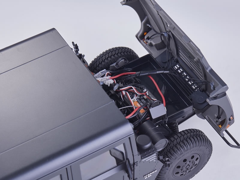 Der HUMMER H1 hat einen Frontmittelmotor wie das reale Fahrzeug, und um die Wartung zu erleichtern, kann die Motorhaube nach vorne geklappt werden, wobei gleichzeitig die vordere Stoßstange nach vorne geklappt werden muss, um Beschädigungen zu vermeiden. Der Haubenverschluss wurde ebenfalls im Maßstab 1:12 nachgebildet und aus 0,4 mm Blech gestanzt. Bei geöffneter Motorhaube sind neben dem V8-Motor auch der 7-Kanal-Empfänger und die Batterie leicht zugänglich.