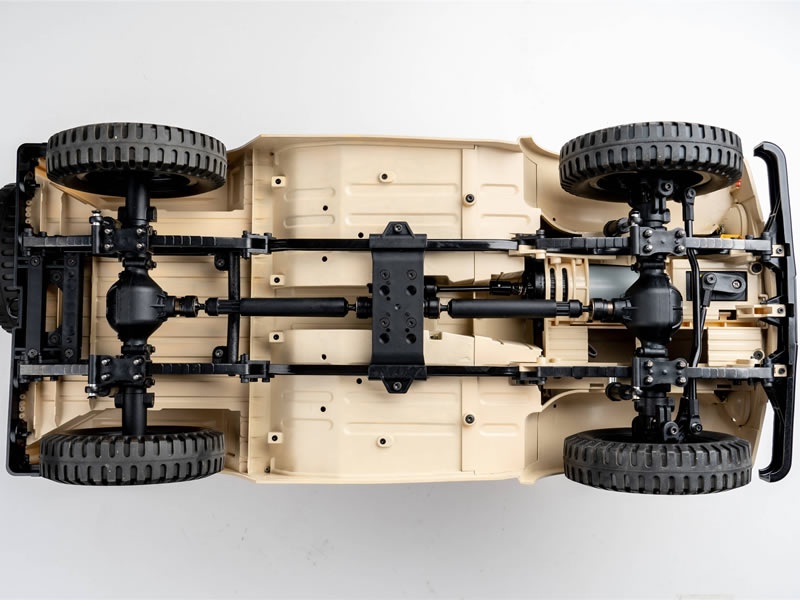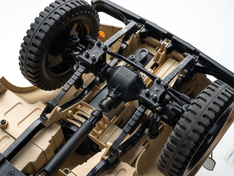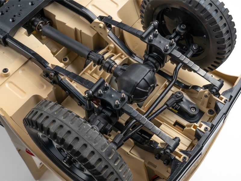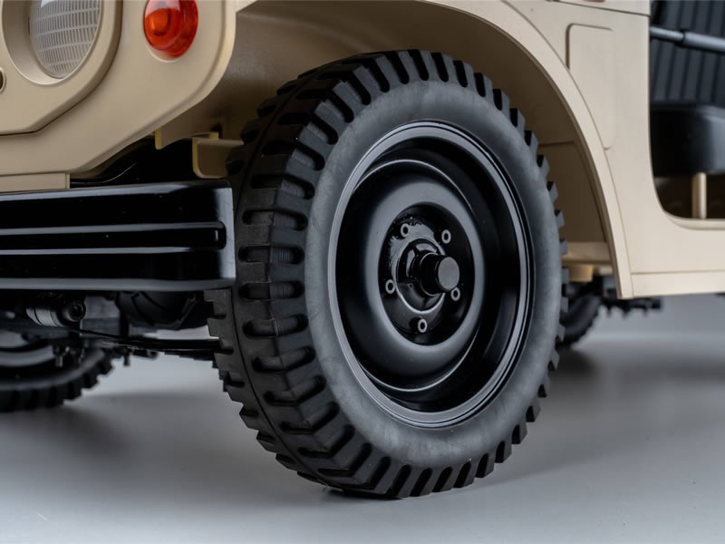 Der Jimny LJ10 von FMS verfügt über zahlreiche Scale Details. Eine klappbare Ladefläche, eine verstellbare Windschutzscheibe, Sicherheitsbügel an den Türen, Außenspiegel mit echten Gläsern und ein bewegliches Reserverad machen den Jimny zum echten Hingucker. Doch auch der Innenraum ist extrem detailliert – ein mitdrehendes Lenkrad, ein Miniatur-Instrumentenbrett, mechanische Knöpfe, Schaltung, Fußpedale und viele weitere Details. Die mit Weichgummi ummantelten Sitze sind weich wie ein Kissen und können zusammengeklappt werden. Perfekt geeignet für 1:6 Figuren.
