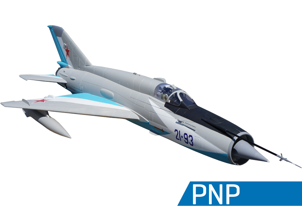 Die beeindruckende Länge der Freewing MiG-21 von 1730 mm stellt das Flugzeug in eine eigene Kategorie. Länger als die meisten Freewing-Jets der 90-mm-Klasse, aber mit der geringeren Flächenbelastung der kleineren Freewing-Jets der 80-mm-Klasse, ist die Freewing MiG-21 die perfekte Balance zwischen Größe, Gewicht, Leistung und Kosten. Seine abnehmbaren Flügel, der horizontale Stabilisator und der vertikale Stabilisator machen den Transport sehr einfach. Sogar der Nasenkegel und das Staurohr sind abnehmbar! Freewing hat viele maßstabsgetreue Details der MiG-21 “MF”-Variante nachgebildet, und die PNP-Version des Flugzeugs wird von einem 80-mm-12-Blatt-EDF und einem brandneuen 3530-1800-kV-Außenläufermotor und 100-A-Regler angetrieben. Der Schub dieses Antriebssystems kann ein 40-Grad-langsames High-Alpha-Manöver aushalten, das mit anderen Jets der 80-mm- und 90-mm-Klassen unmöglich ist. Neu gestaltete Digitalservos mit Metallgetriebe steuern die Querruder, Klappen, Höhenruder und Seitenruder, und eine integrierte Leiterplatte vereinfacht die Verkabelung im großen Batteriefach. Magnetische Kraftstofftanks und die ikonischen “Blasen” im gesamten Rumpf tragen dazu bei, das Erscheinungsbild der bedrohlichen MiG-21 zu vervollständigen. Obwohl die Freewing MiG-21 ein Flugzeug der 80-mm-Klasse ist, verfügt sie über das größere einziehbare Fahrwerk eines Flugzeugs der 90-mm-Klasse. Langlebige Aluminium-Längslenkerstreben und hohe Schaumgummiräder ermöglichen den Einsatz auf kurzen Rasenflächen.