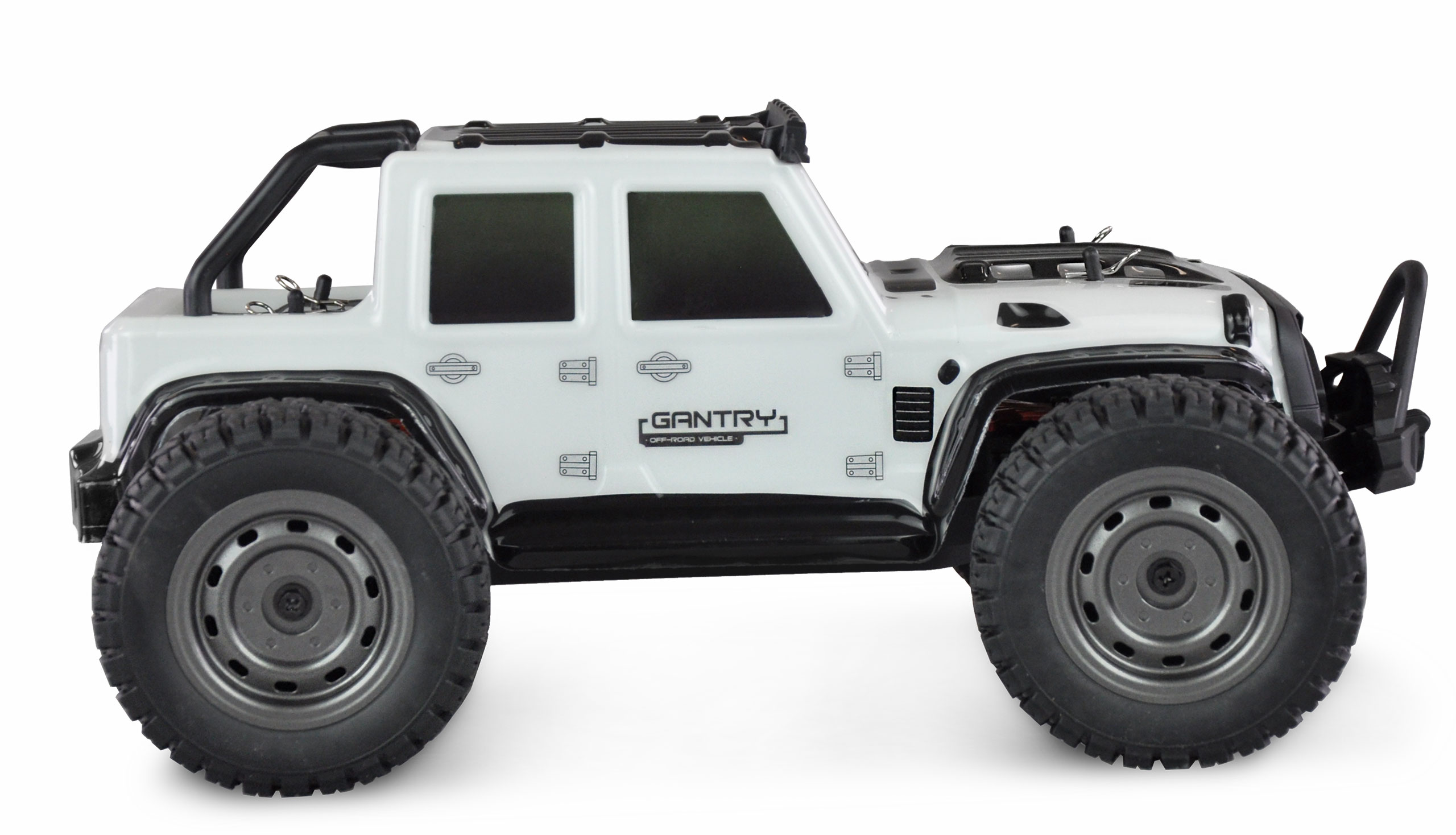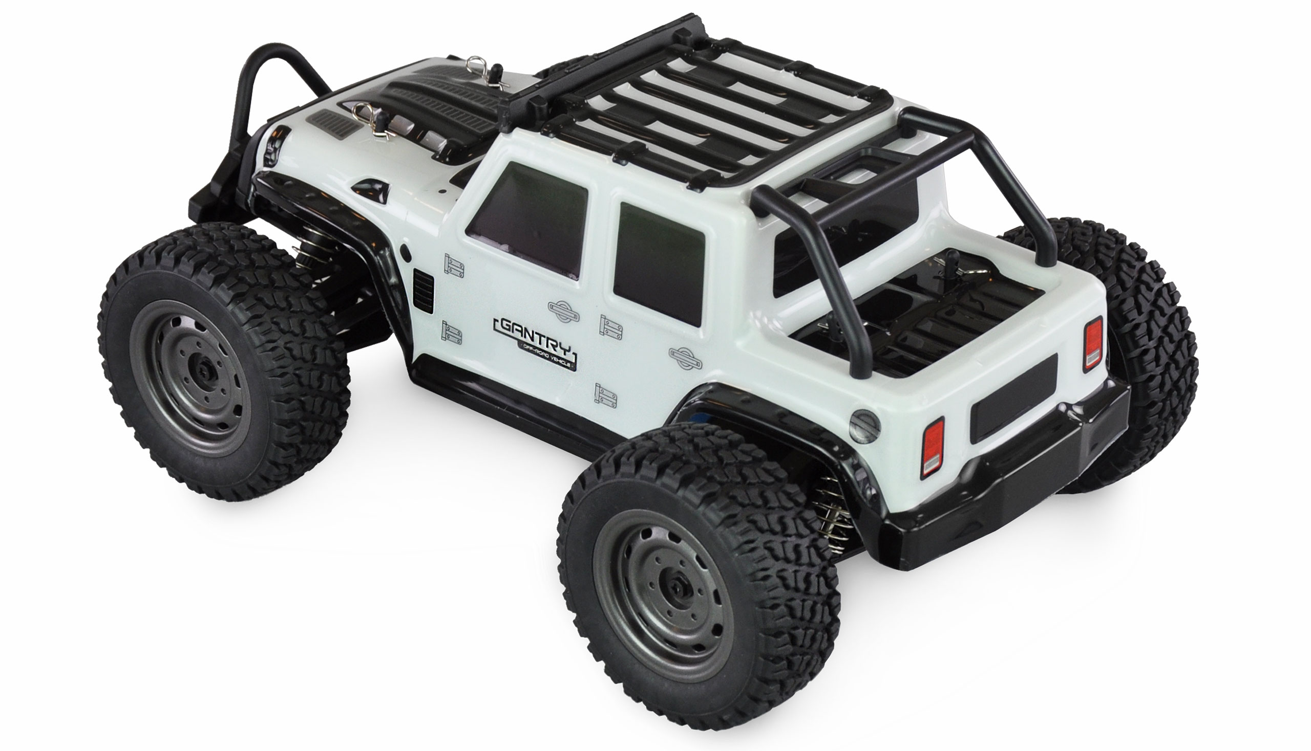 Allein optisch ein Hingucker macht der Gantry Cross-Country Truck im Maßstab 1:16 auch bei Action im Gelände eine gute Figur: Metall-Kardanwellen und CVD-Antriebswellen vorne sorgen für direkte Kraftübertragung an die Räder. Dank 390er Racing-Brushed-Motor und Li-Ion Power sind Geschwindigkeiten von bis zu 40km/h möglich. Durch das Top-Deck aus Aluminium erhält das gesamte Modell mehr Festigkeit.